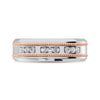 Surprise the love of your life with a 10K white gold diamond Weddin Ring band he will cherish and adore. Floating within channel setting, brilliant round diamonds totaling a stunning 1/4 ct. exude unique shine. For an artful final touch, the edging is textured with a rose gold milgrain finish.
