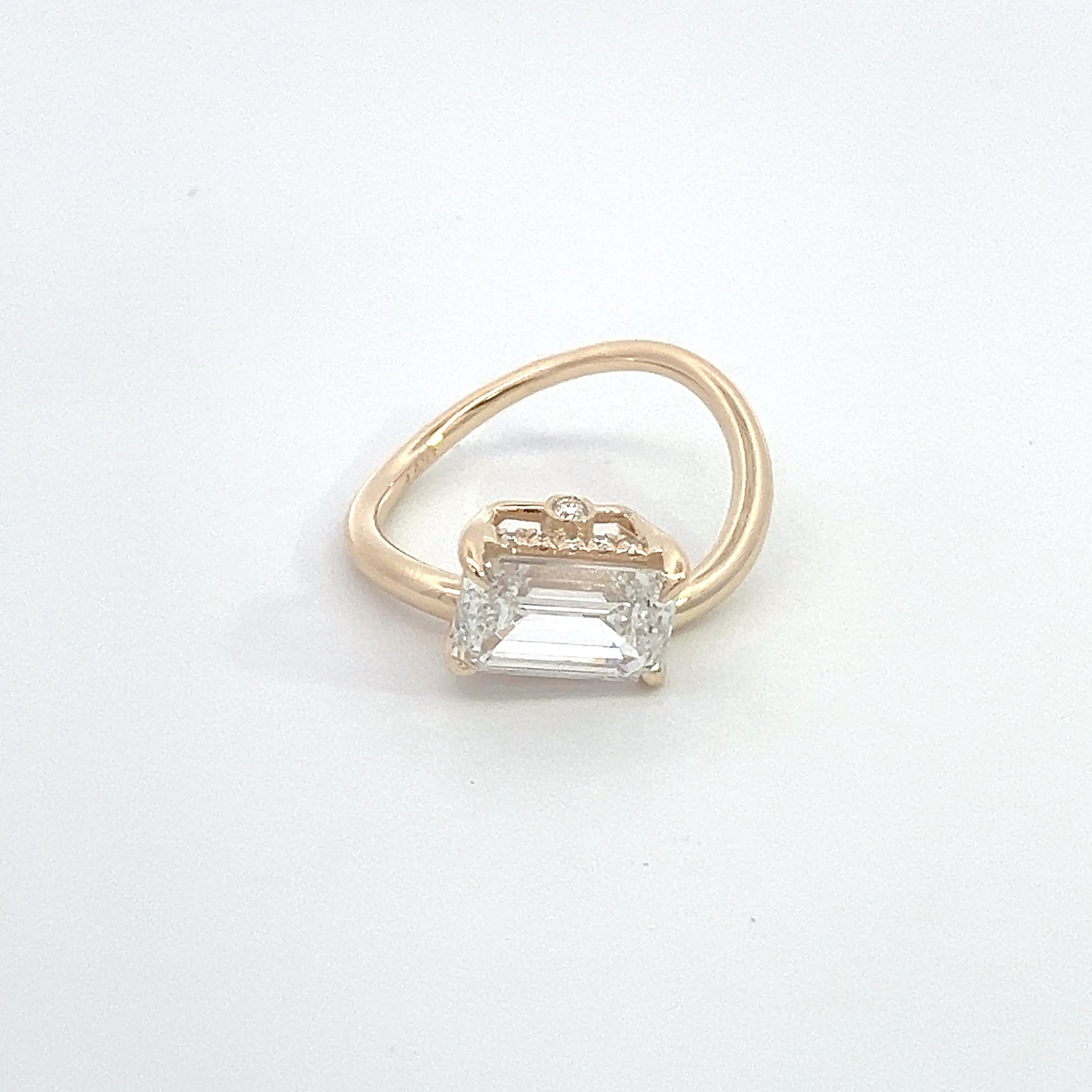 An exquisite ring featuring brilliant emeral cut diamond set in 14K white gold.