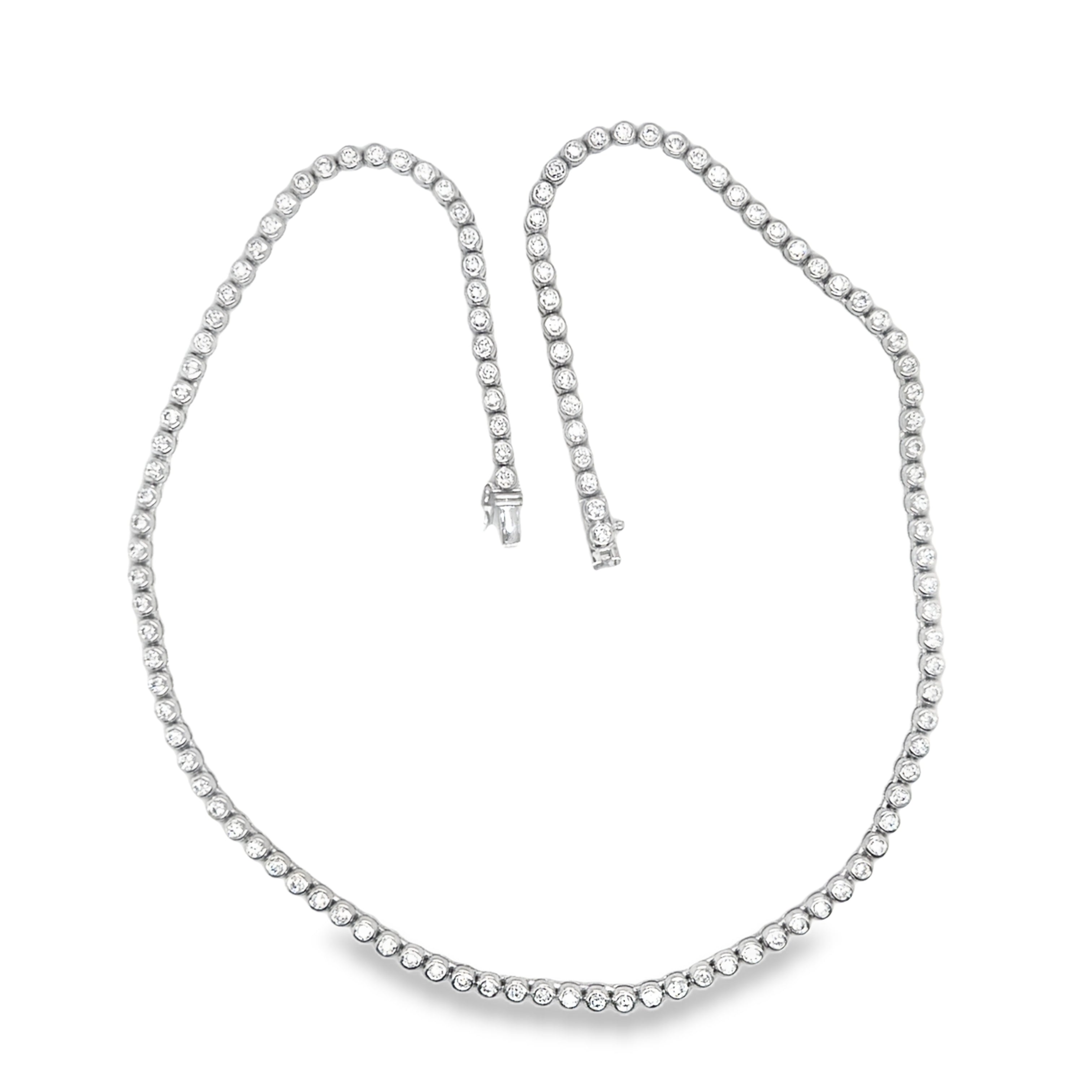 Individually bezel set round brilliant cut diamonds along the length of the necklace with a double safety clasp