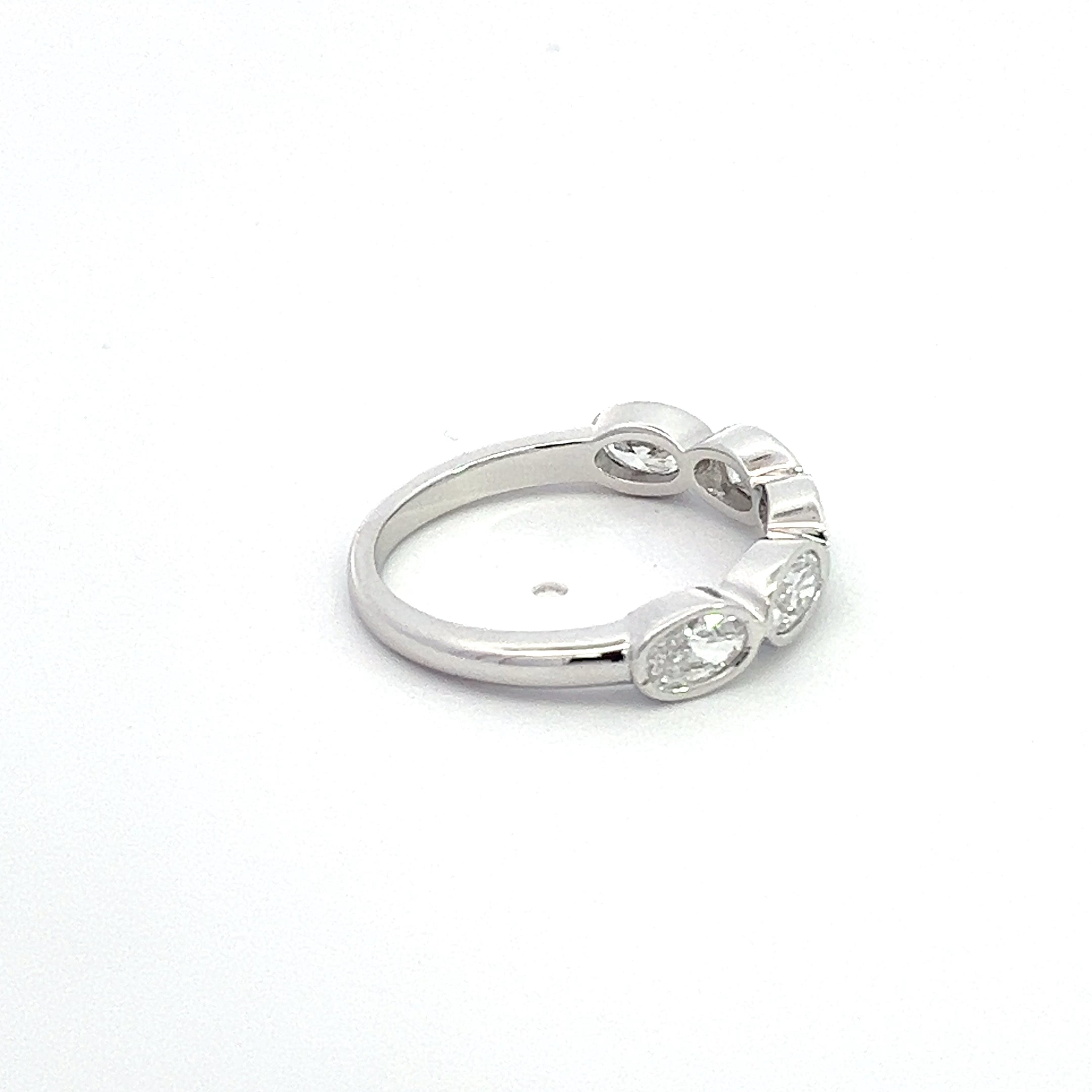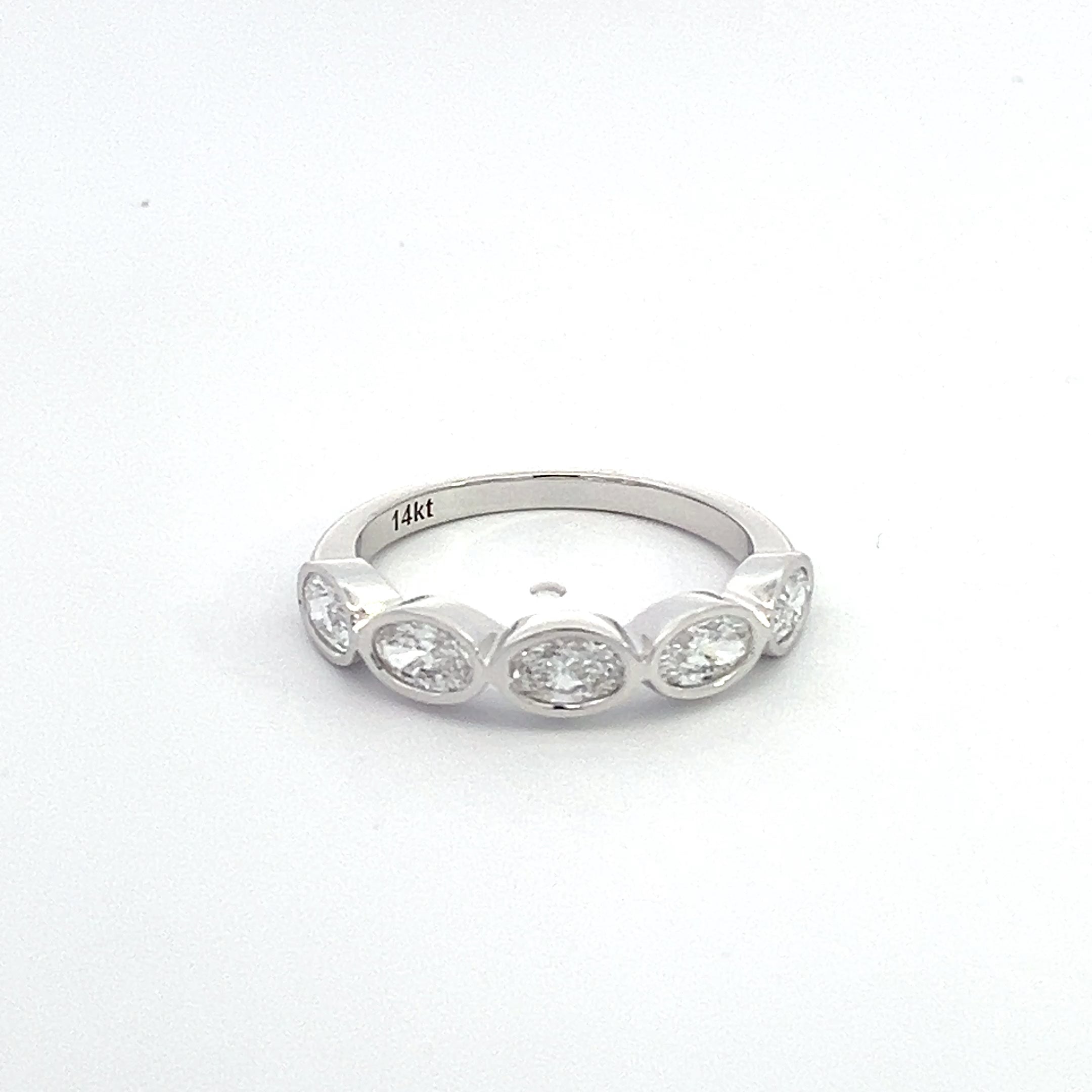 This ring features oval brilliant cut lab grown diamonds. All diamonds are bezel set in solid 14k gold. This ring is ideal for layering with other bands or enhancing an engagement ring