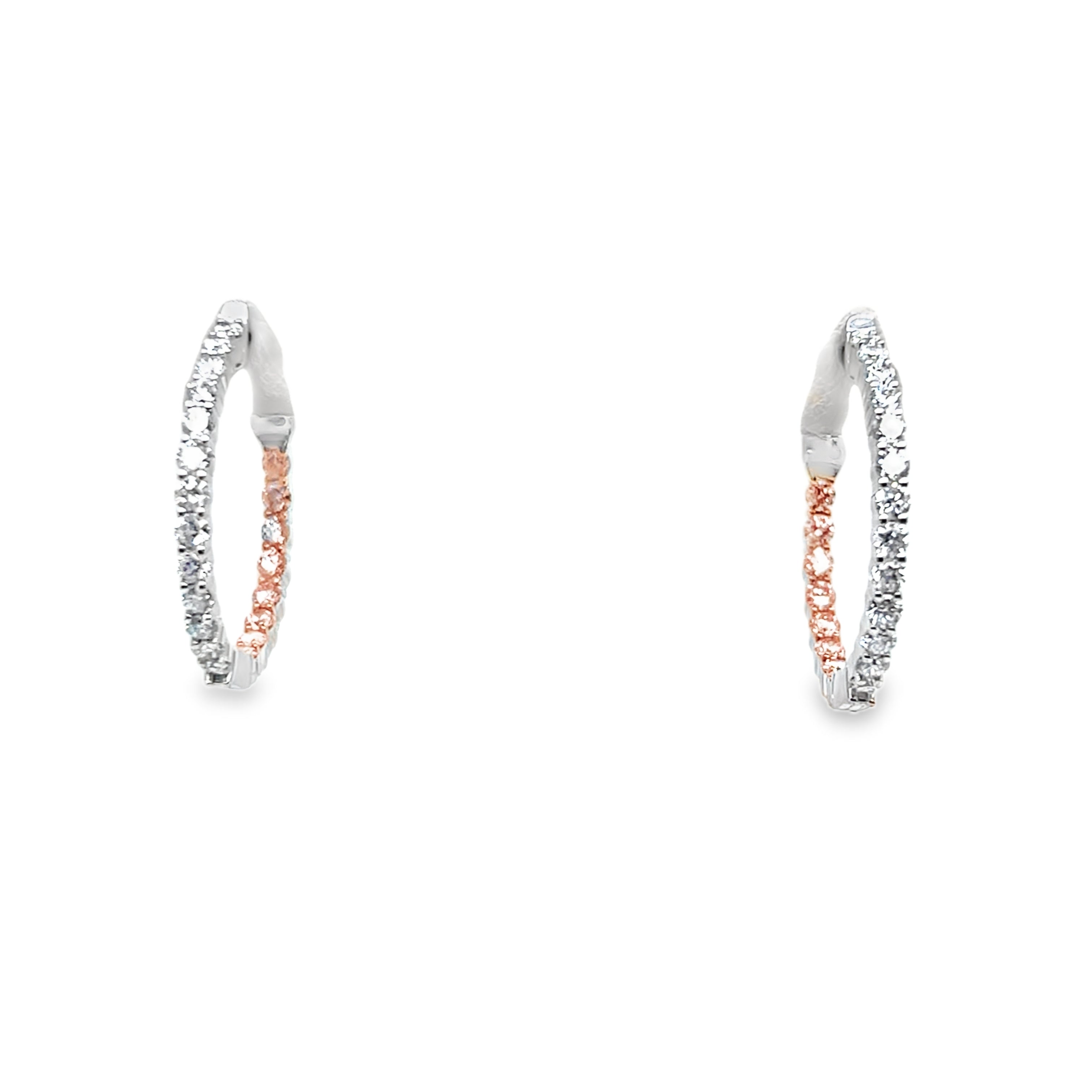 Diamonds set on the front outside and also on the back inside of the hoop with a special locking mechanism to open the earrings.