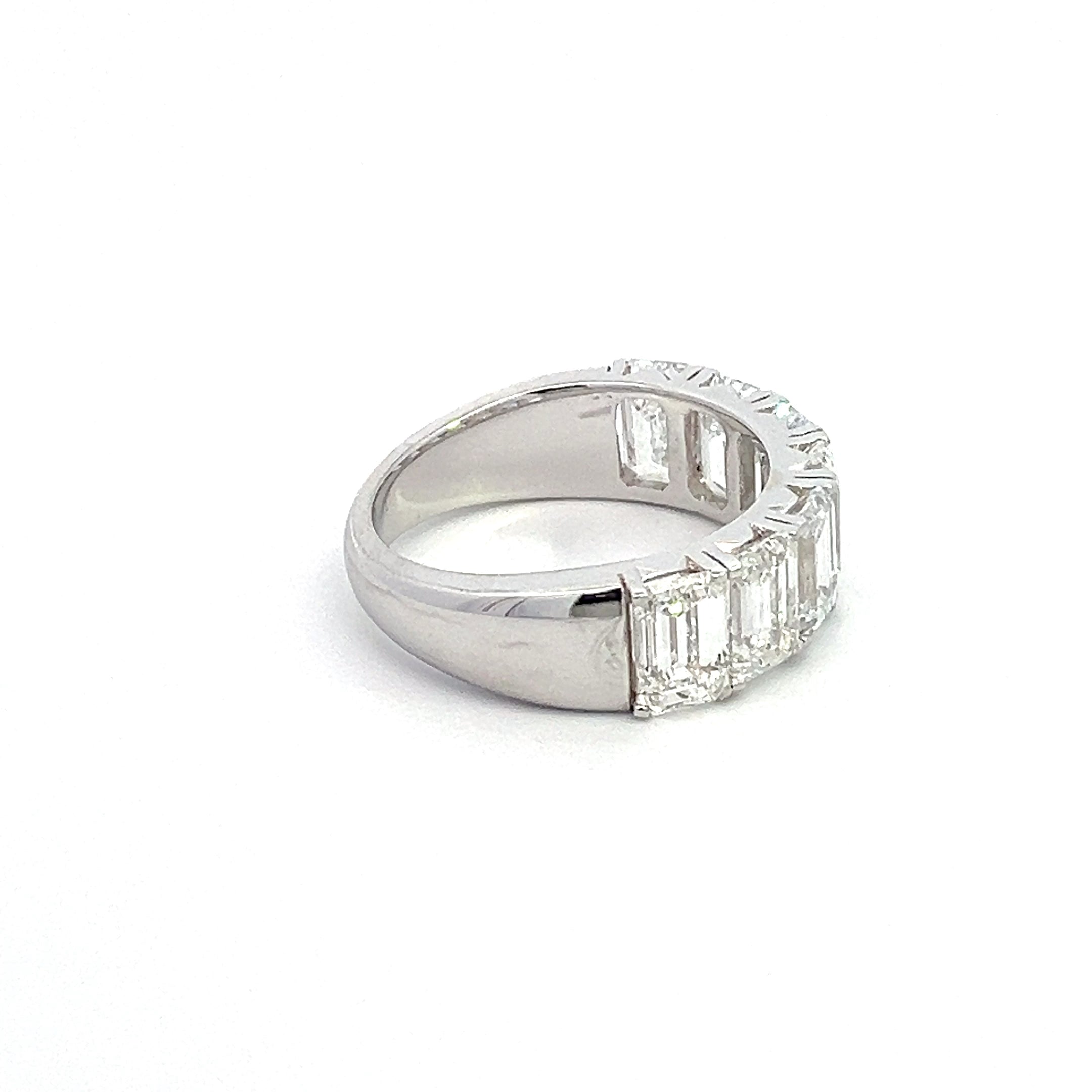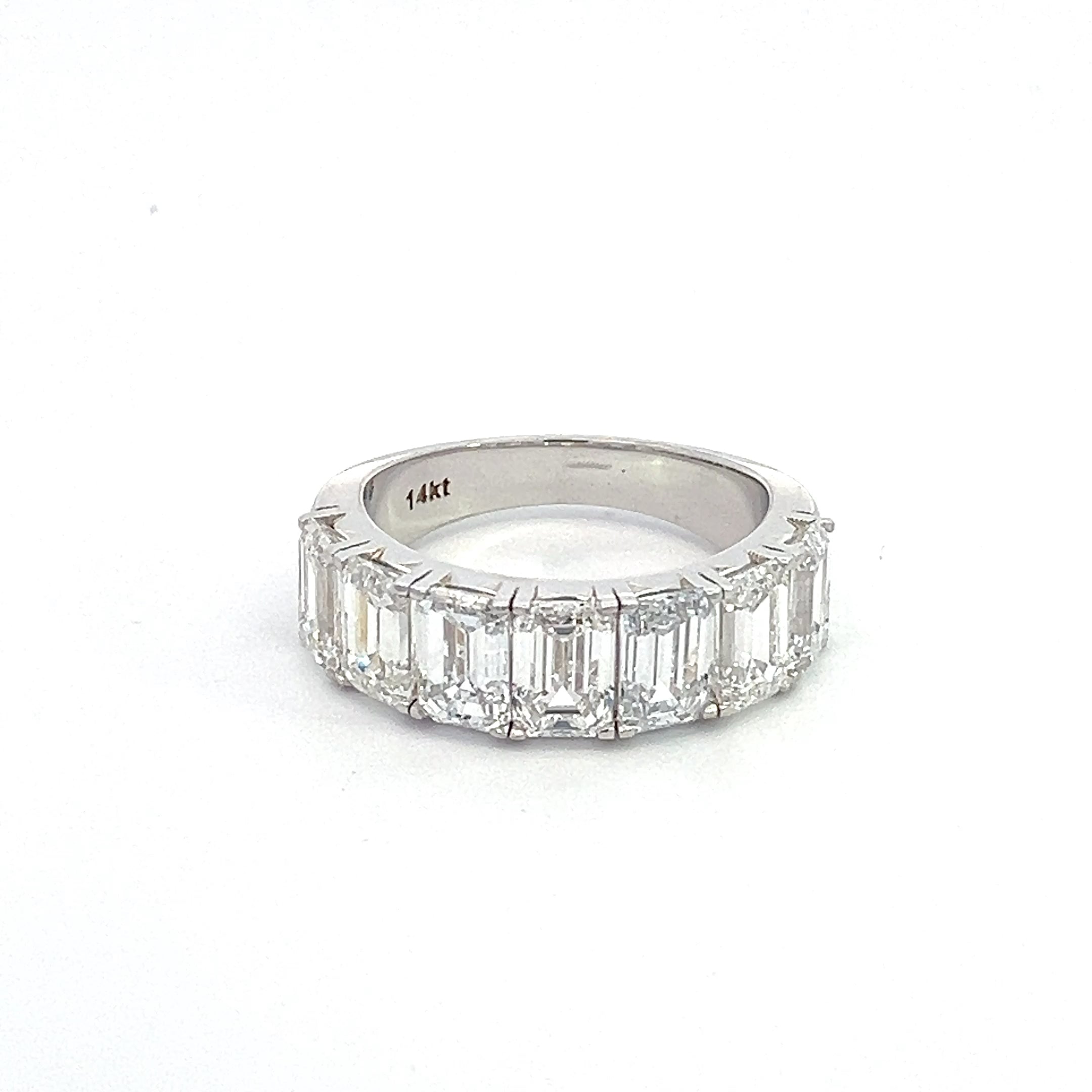 This ring features emerald brilliant cut lab grown diamonds. All diamonds are prong set in solid 14k white gold. This ring is ideal for layering with other bands or enhancing an engagement ring