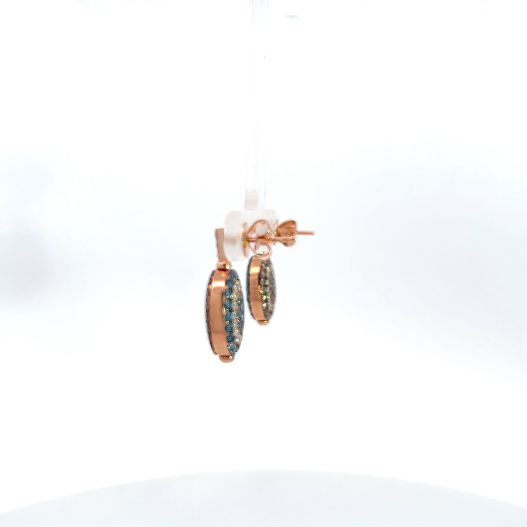 14K ROSE GOLD OVAL EARRINGS WITH CHOCOLATE DIAMONDS ON ONE SIDE AND BLUE DIAMONDS ON THE OTHER.