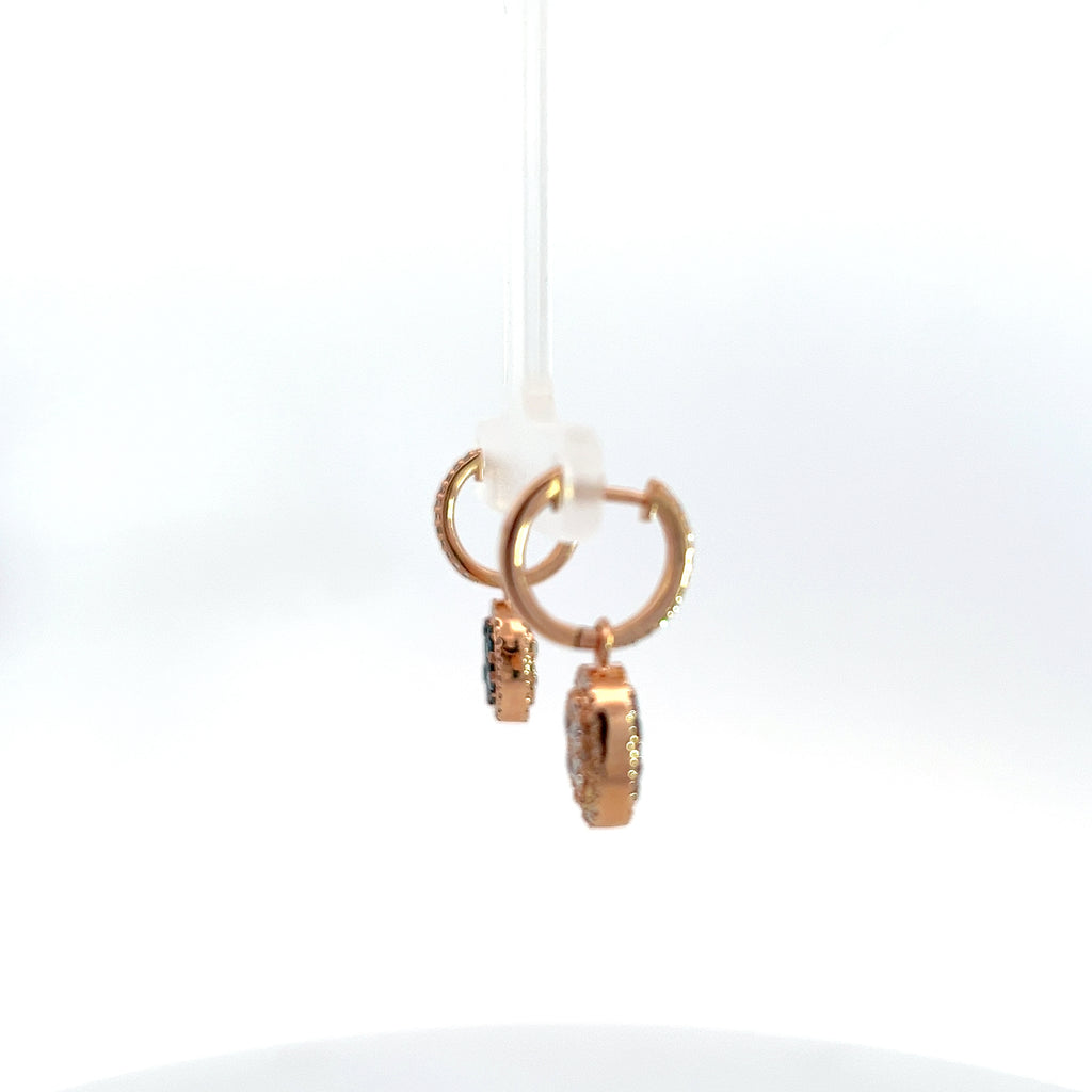 14K ROSE GOLD OVAL EARRINGS WITH BLUE DIAMONDS ON ONE SIDE AND WHITE DIAMONDS ON THE OTHER.