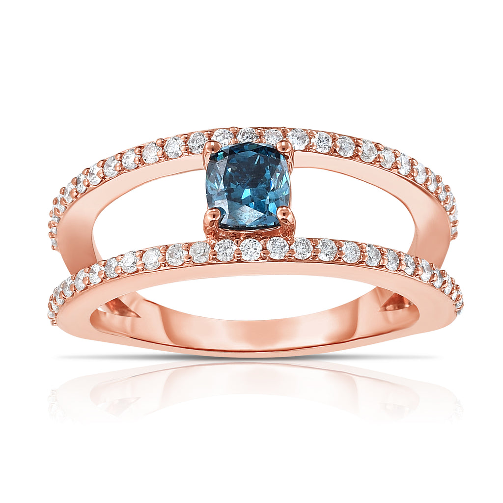 Prong set cushion cut blue diamond suspended in between two shanks, each set with shared prong white round brilliant cut diamonds, all set in 14K rose gold ring.
