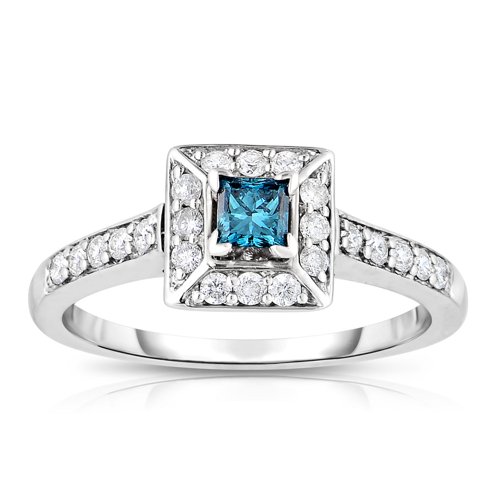 Prong set princess cut blue diamond with prong set white brilliant cut diamonds halo, flanked on each side with a single row of prong set white brilliant cut diamonds on the shank, all set in 14K white gold ring.