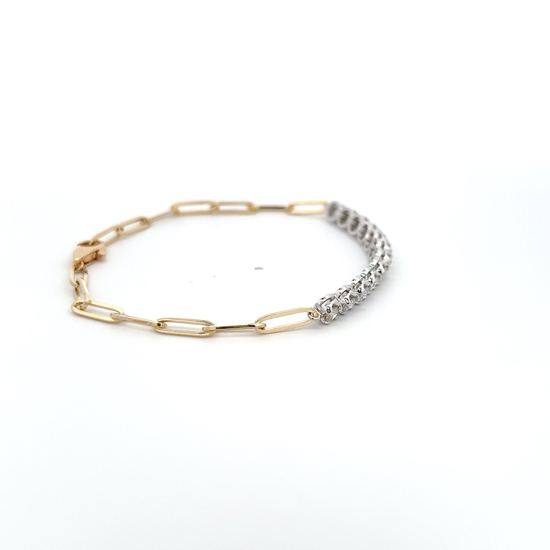 Round brilliant cut diamonds along the length of the bracelet set in 14K gold, 7 inches long with a lobster clasp.
