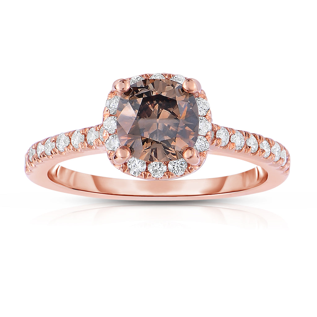 Prong set round brilliant cut natural champagne diamond with pave set white brilliant cut diamonds halo, flanked on each side with a single row of pave set white brilliant cut diamonds on the shank, all set in 14K rose gold ring.