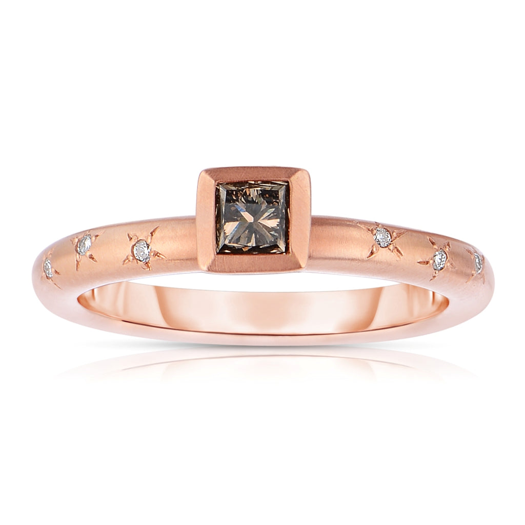 Bezel set princess cut natural champagne diamond with burnish set white brilliant cut diamonds in a star design on the solid shank, all set in 14K rose gold ring.