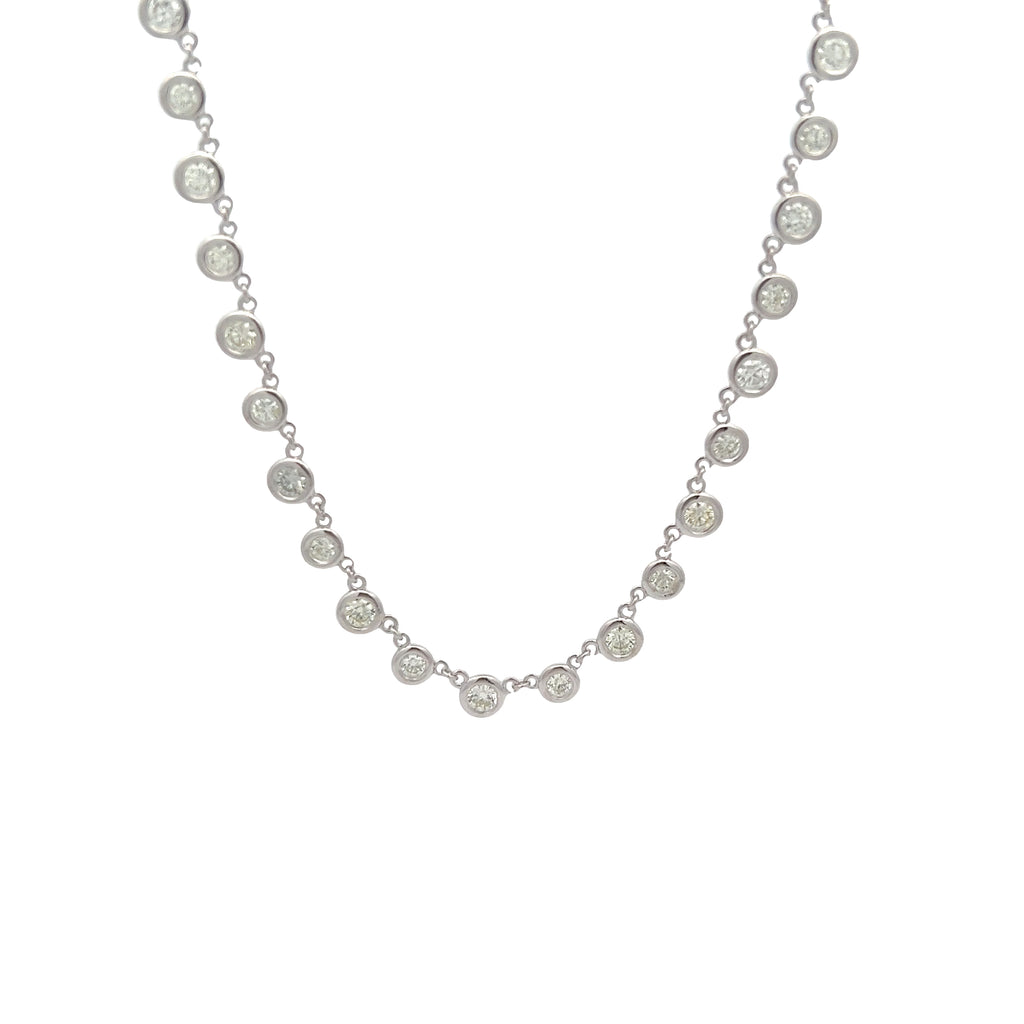 Individually bezel round brilliant cut diamonds evenly spaced along the 18" length of the necklace, each connected with a solid gold chain, ending with a strong clasp.