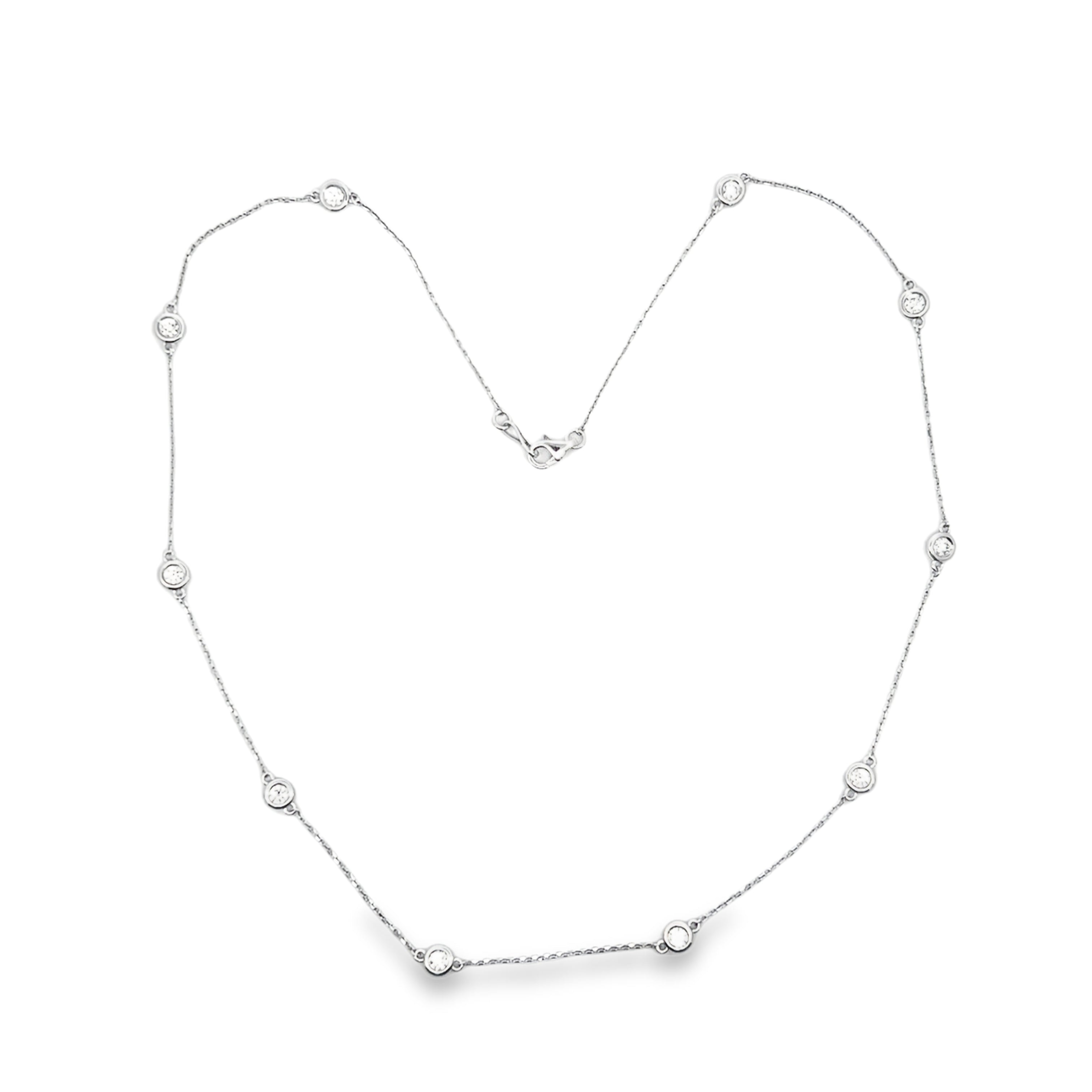 Individually bezel round brilliant cut diamonds evenly spaced along the 18" length of the necklace, each connected with a solid gold chain, ending with a strong clasp.