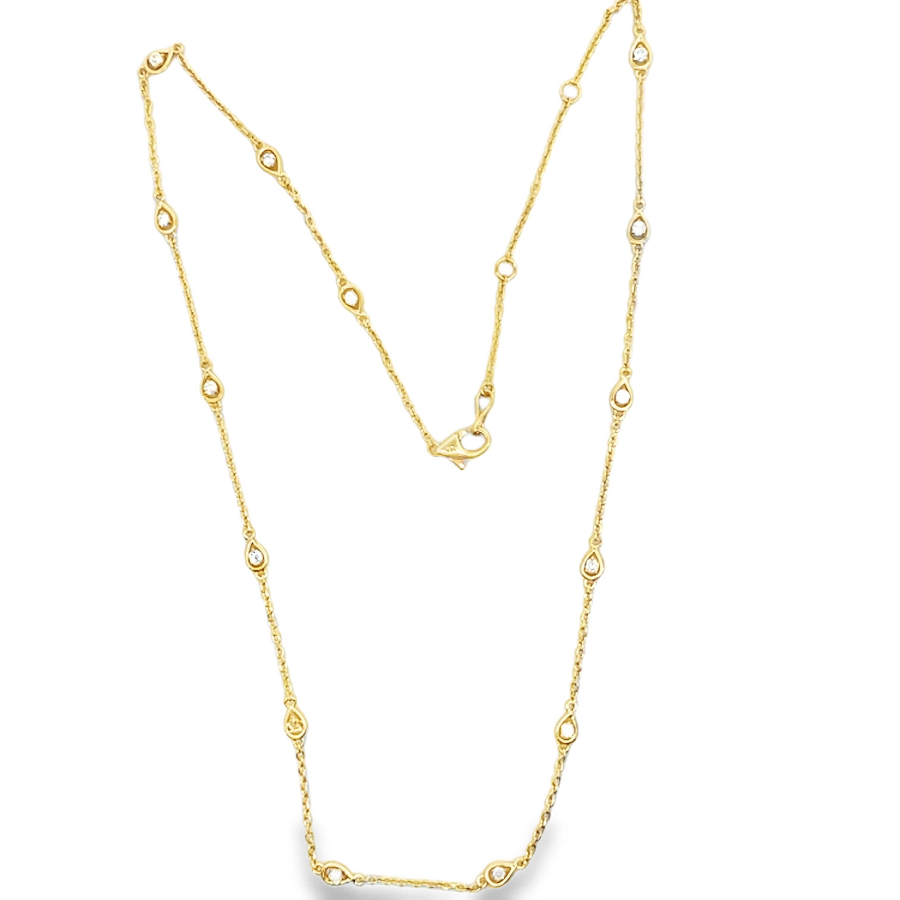 Individually bezel round brilliant cut diamonds evenly spaced along the 18" length of the necklace, each connected with a solid gold chain, ending with a strong clasp.
