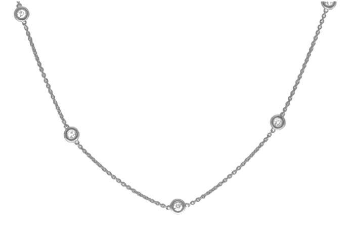 Individually bezel round brilliant cut diamonds evenly spaced along the 18" length of the necklace, each connected with a solid gold chain, ending with a strong clasp.