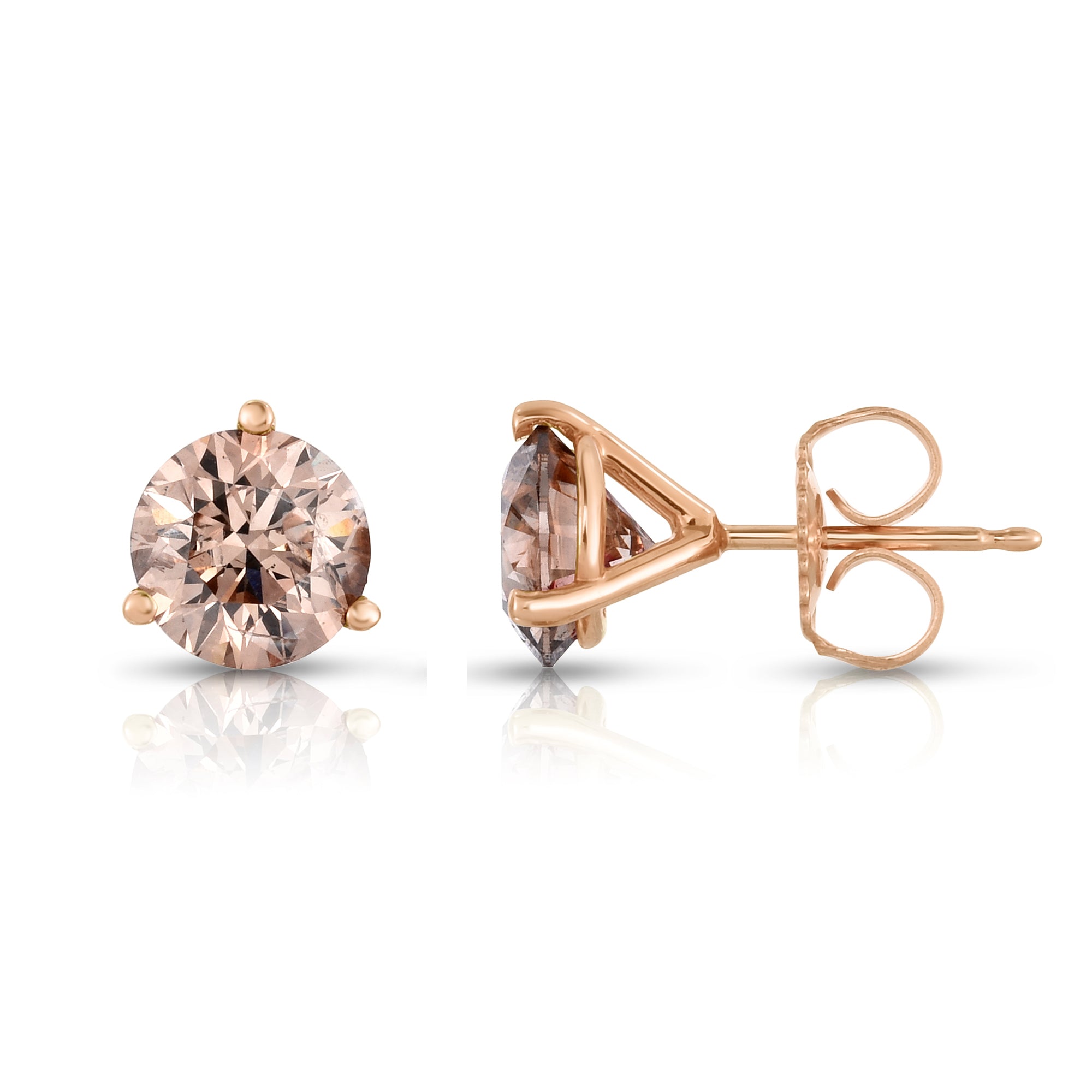 Matching pair of prong set round brilliant cut natural champagne diamonds set in 14K rose gold push back martini style stud earrings.