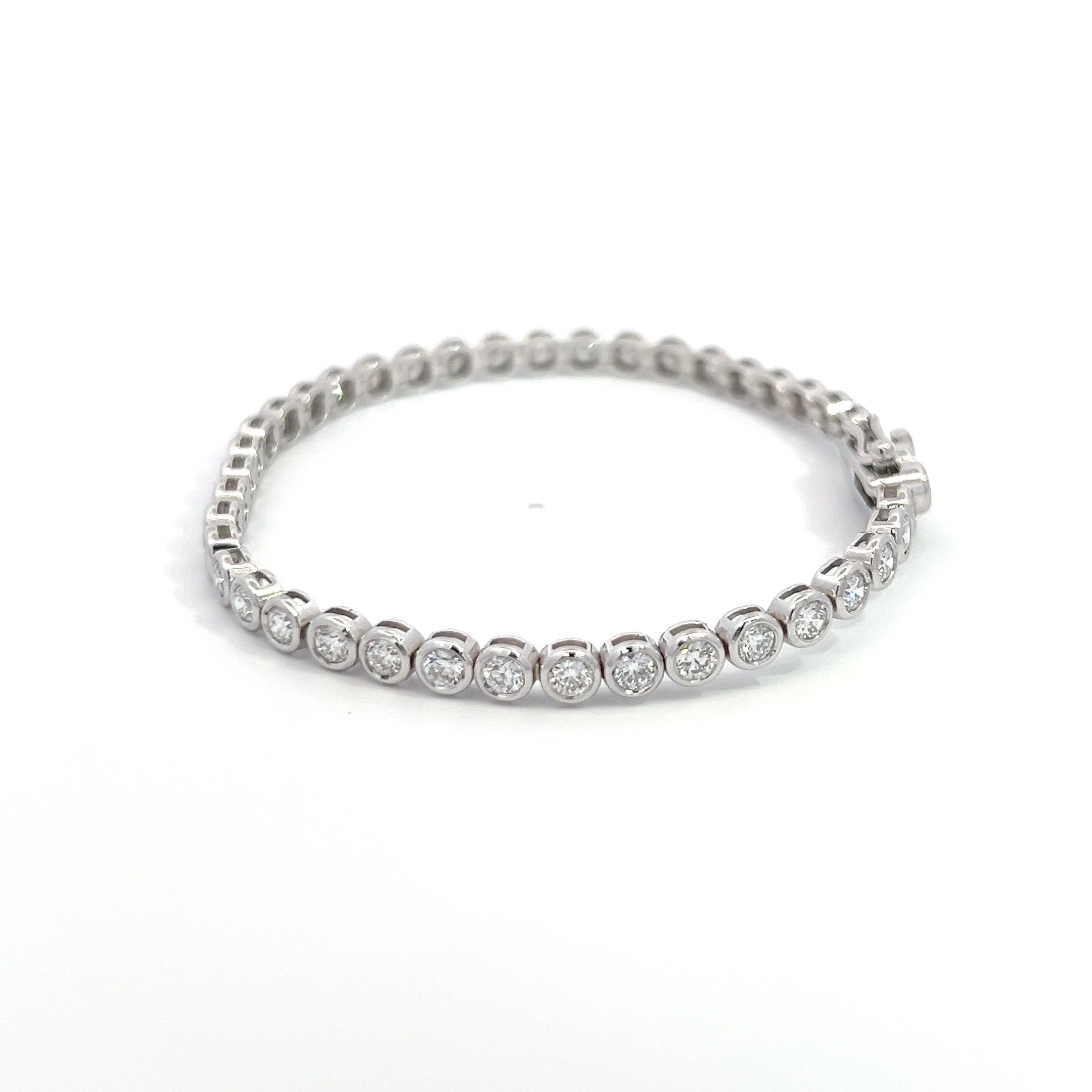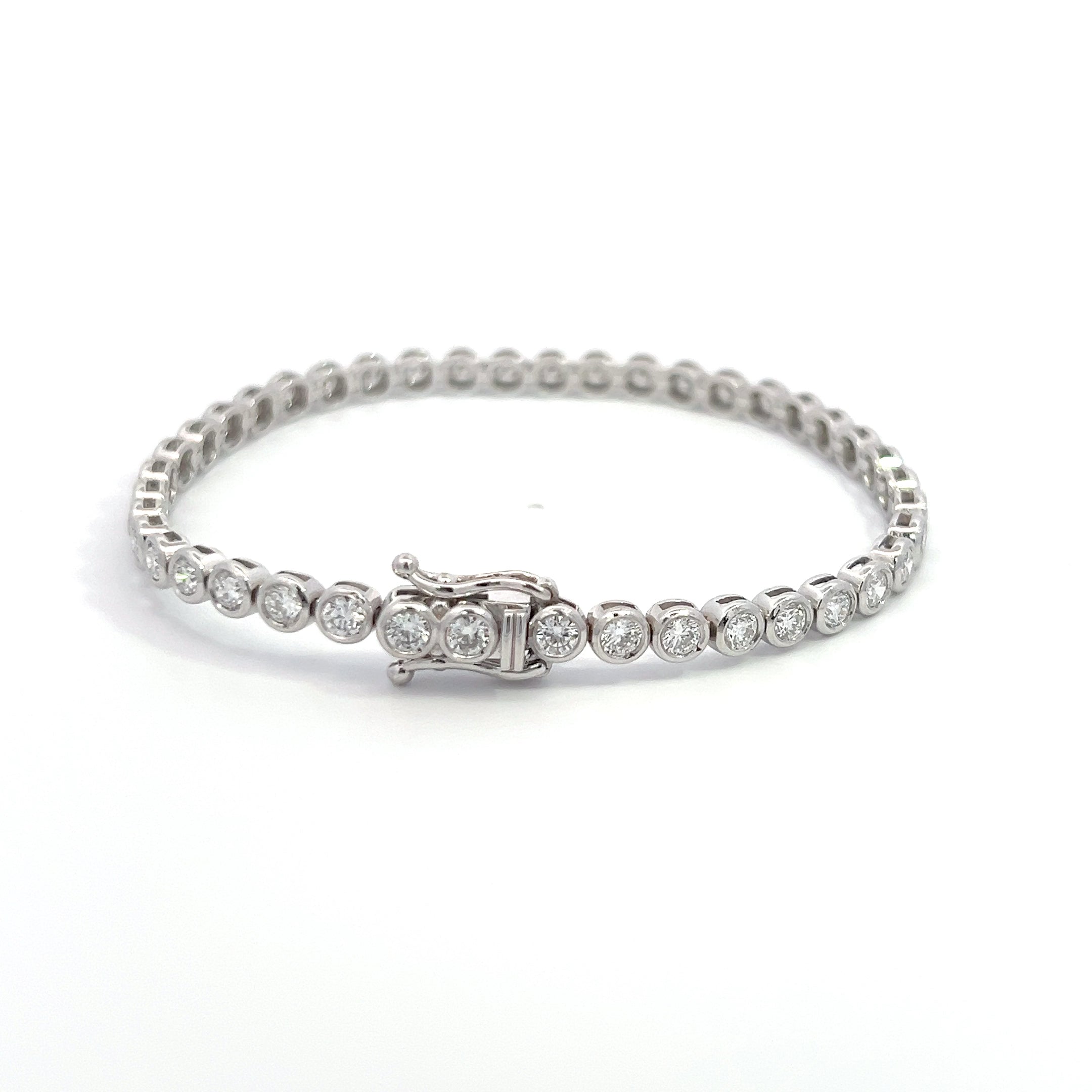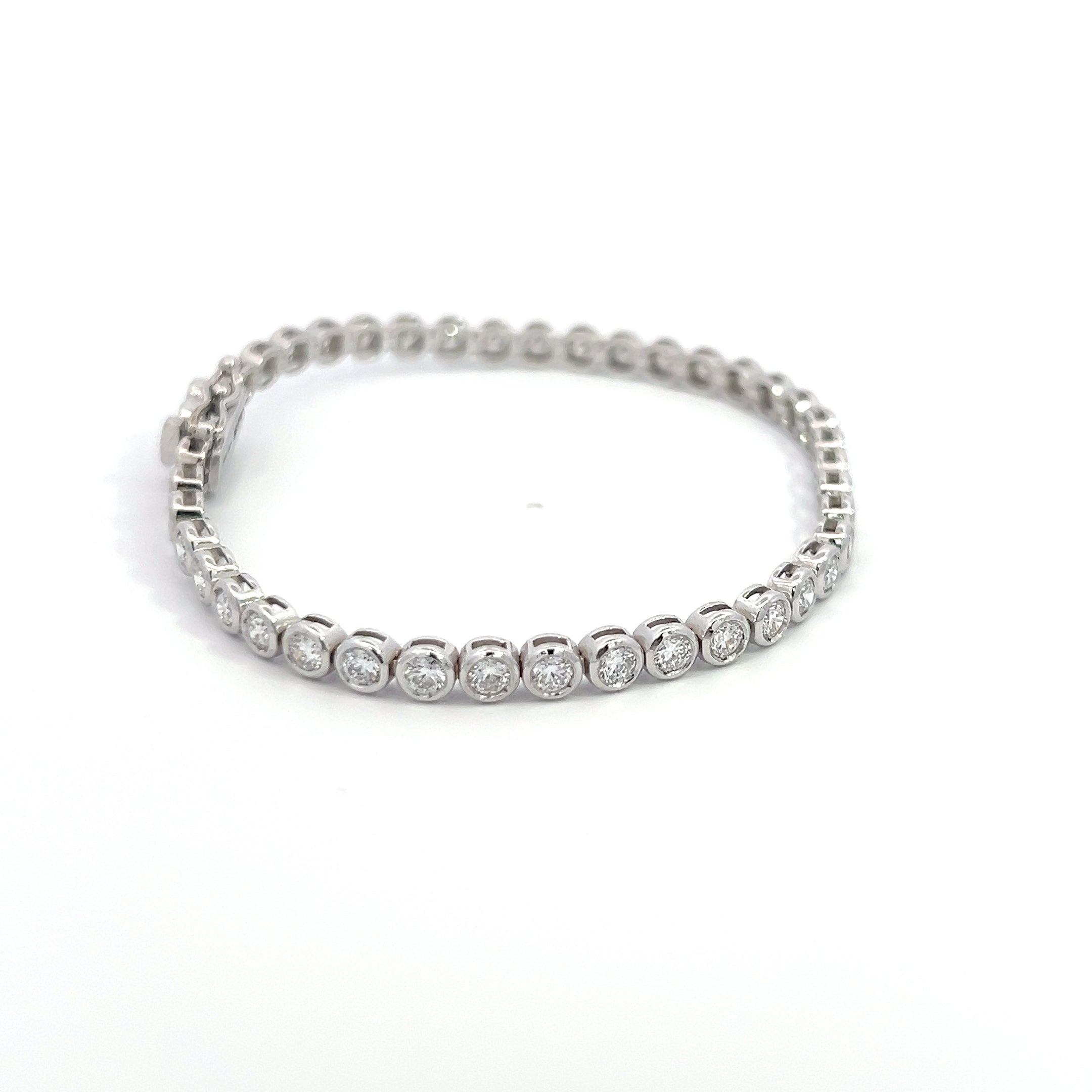 Round brilliant cut lab-grown diamonds along the length of the bracelet set in 14K white gold, 7 inches long with a double safety clasp.