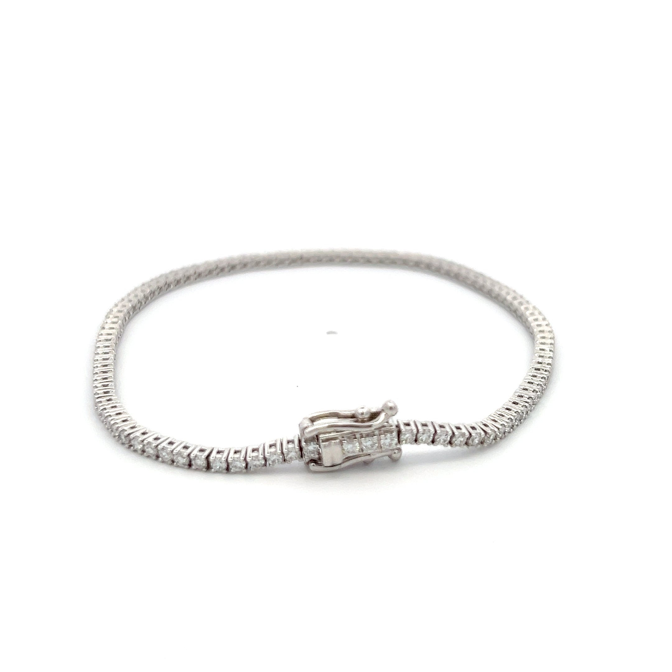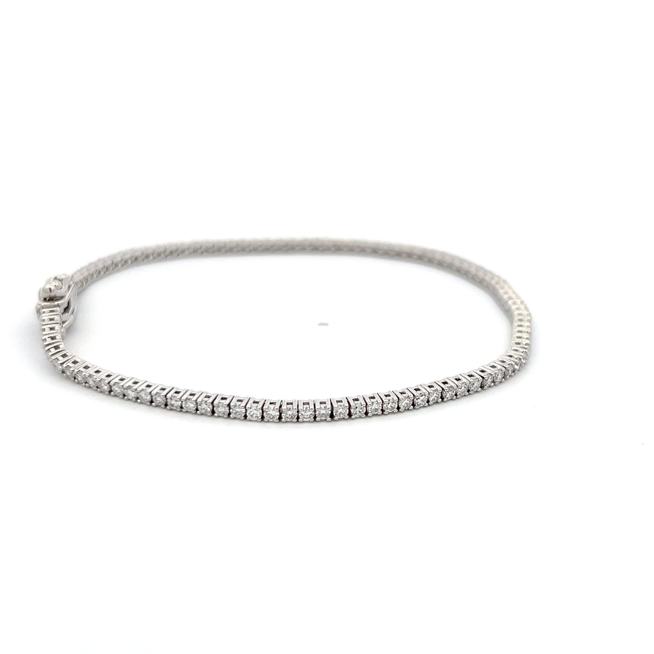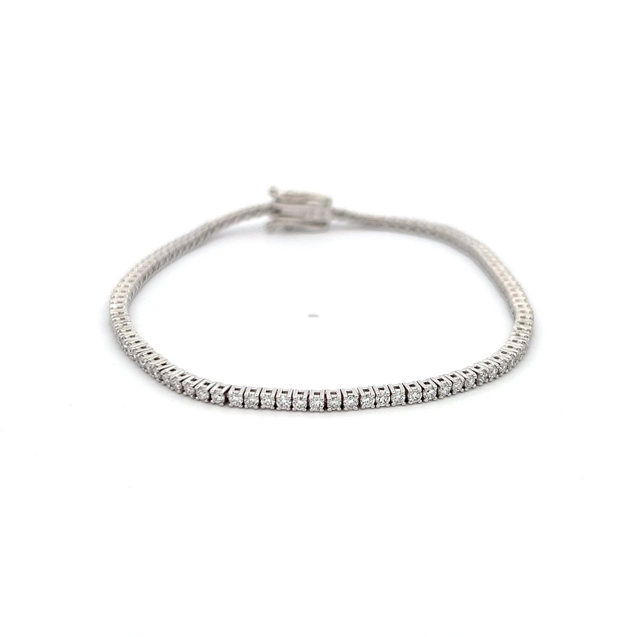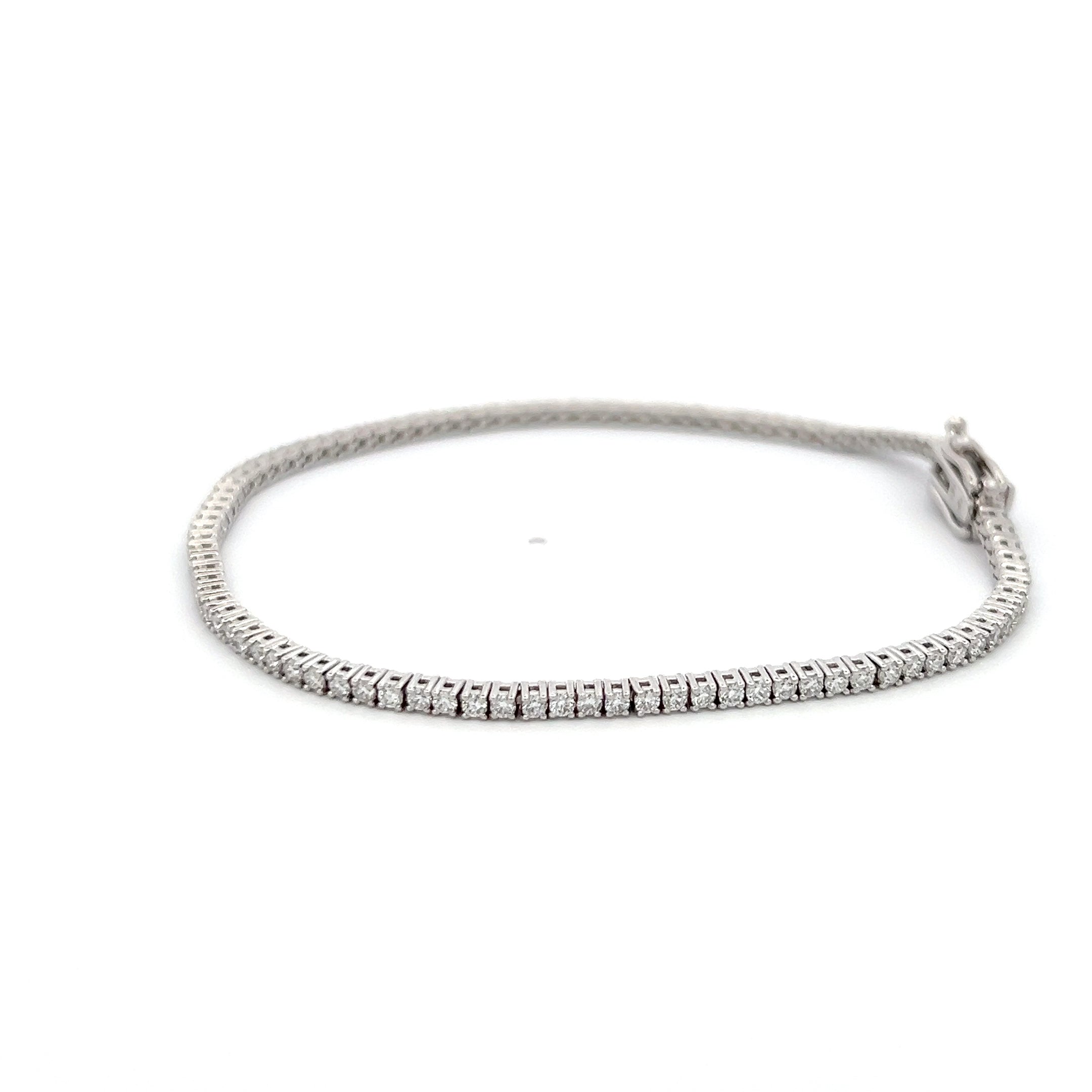 Round brilliant cut lab-grown diamonds along the length of the bracelet set in 14K white gold, 7 inches long with a double safety clasp.