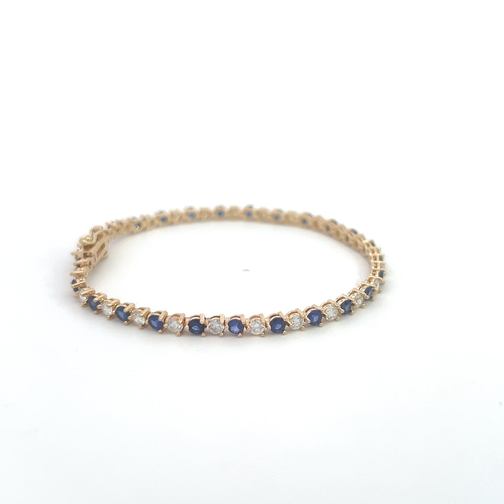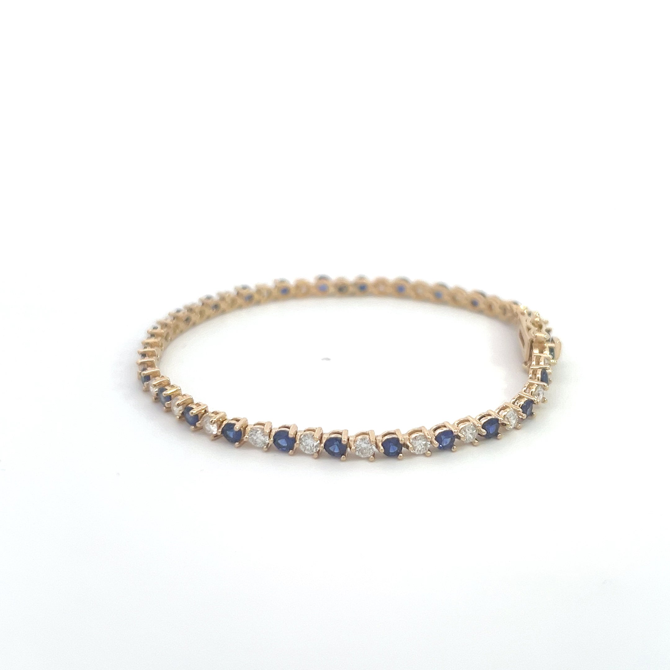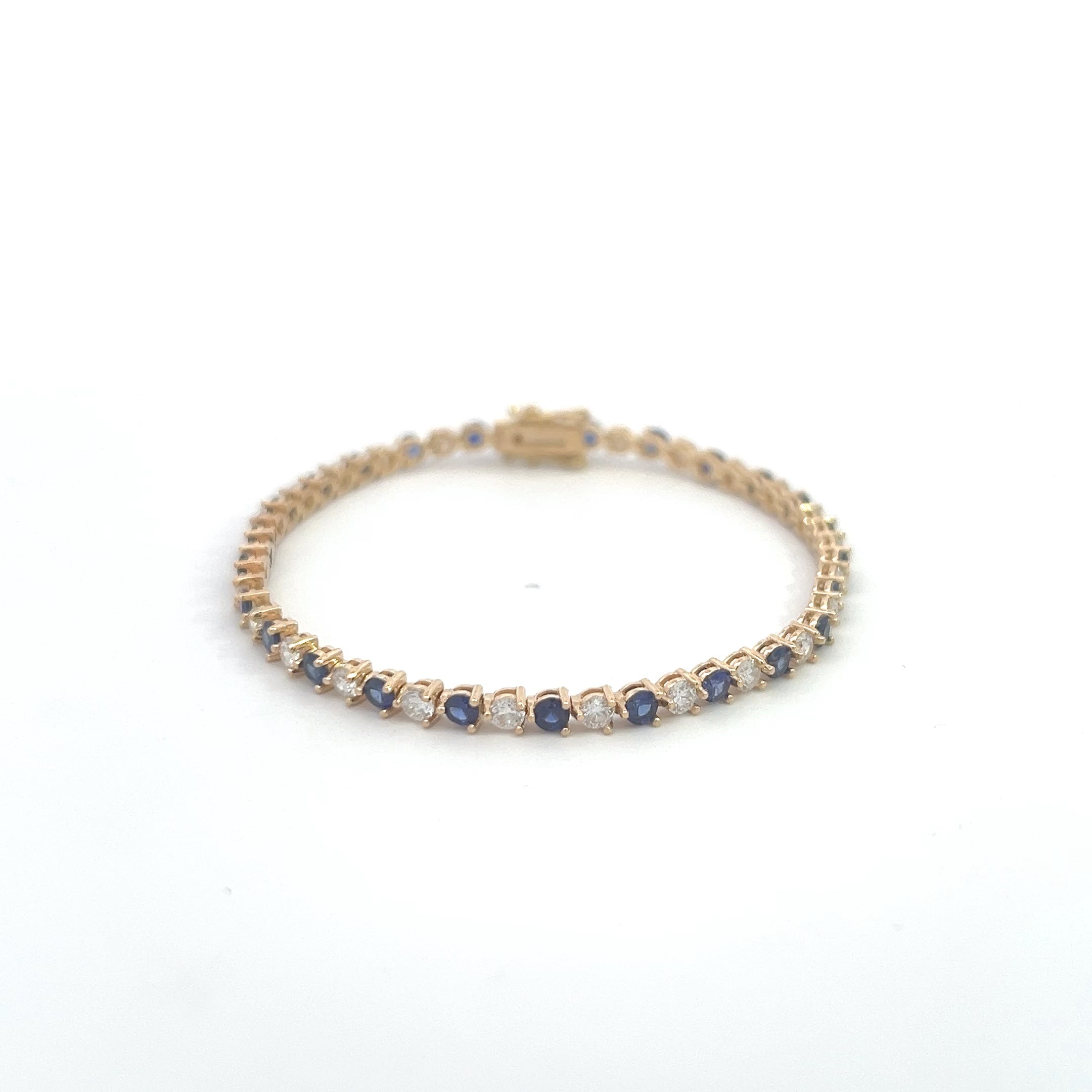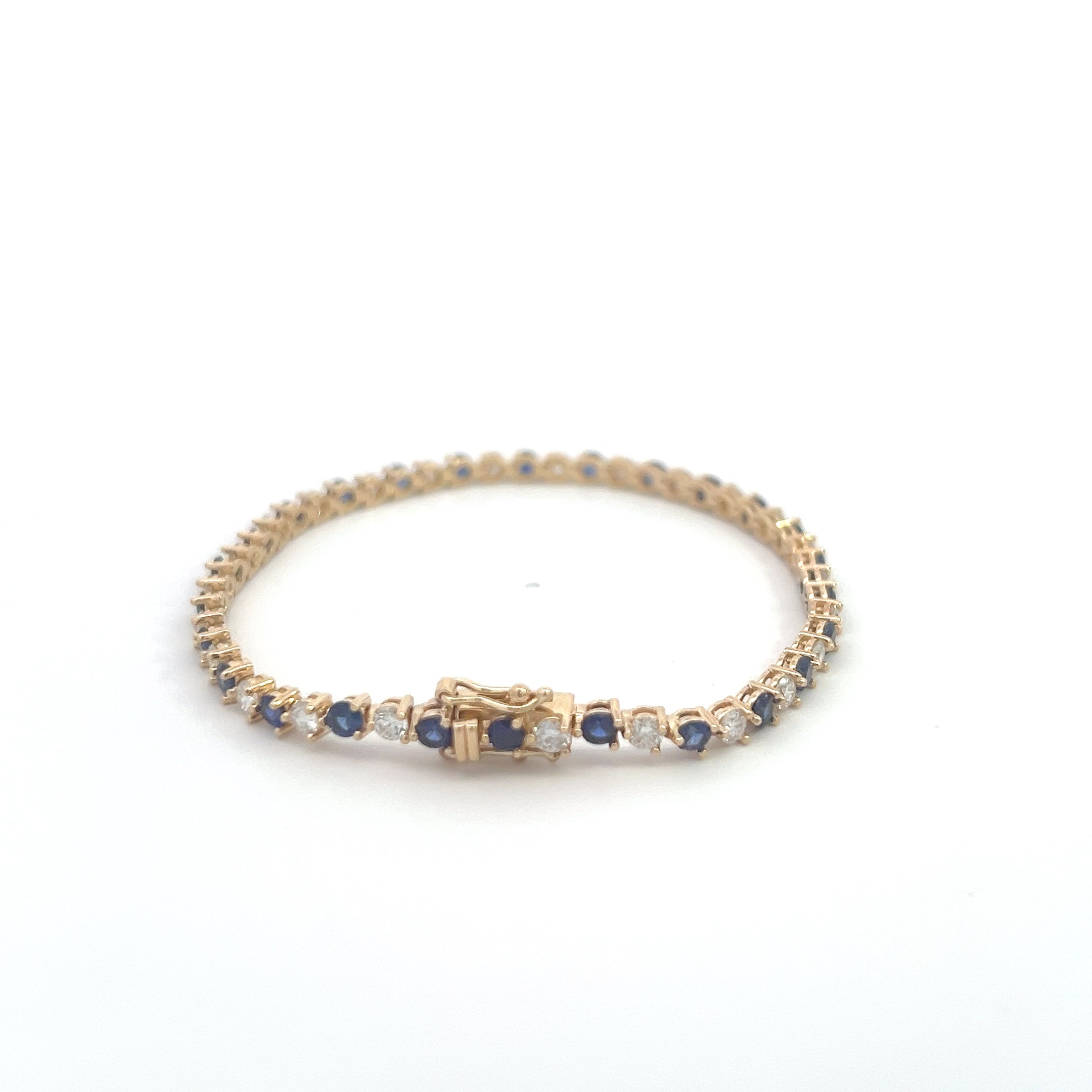 Round brilliant cut diamonds and sapphires along the length of the bracelet set in 14K yellow gold, 7 inches long with a double safety clasp.
