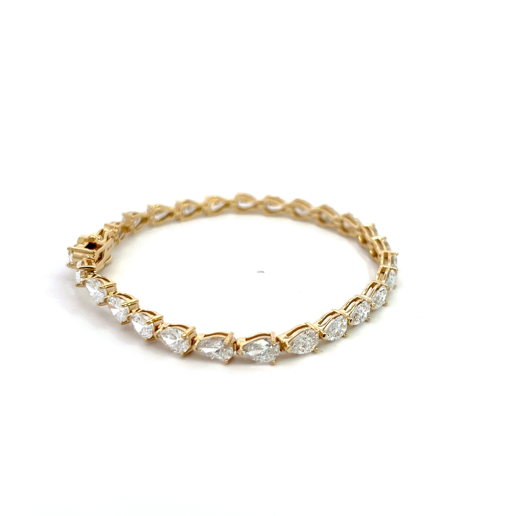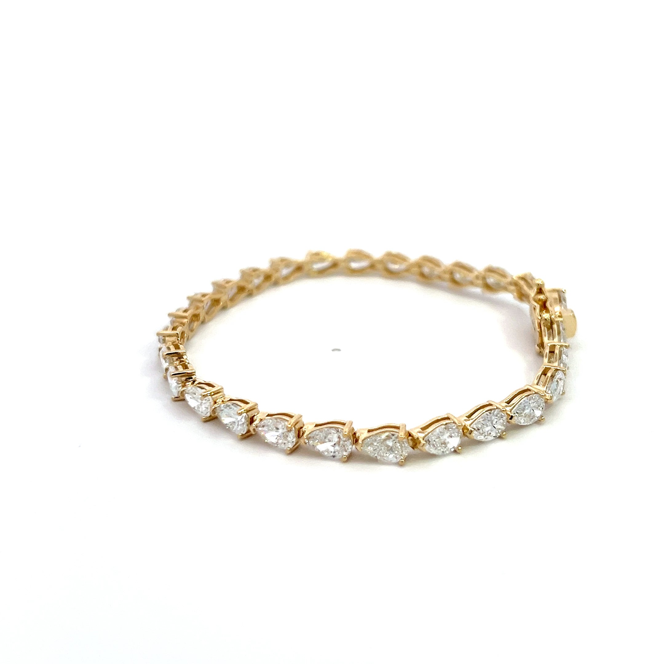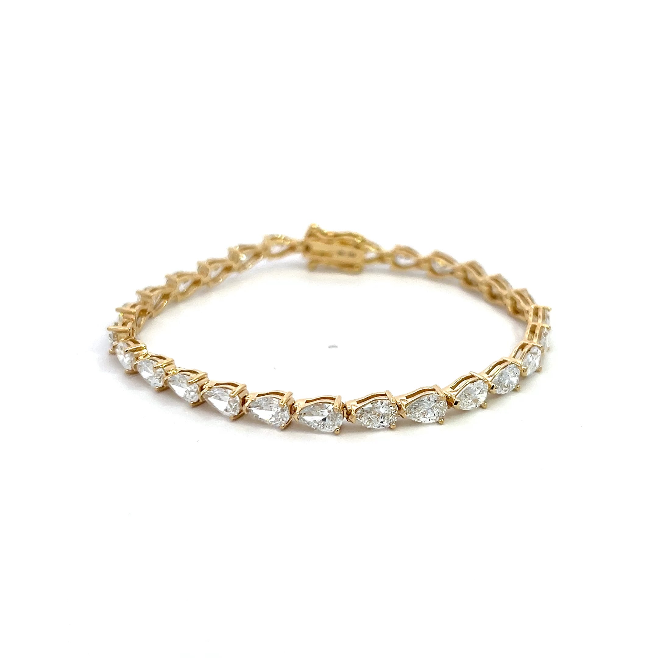 Pear brilliant cut lab-grown diamonds along the length of the bracelet set in 14K yellow gold, 7 inches long with a double safety clasp.