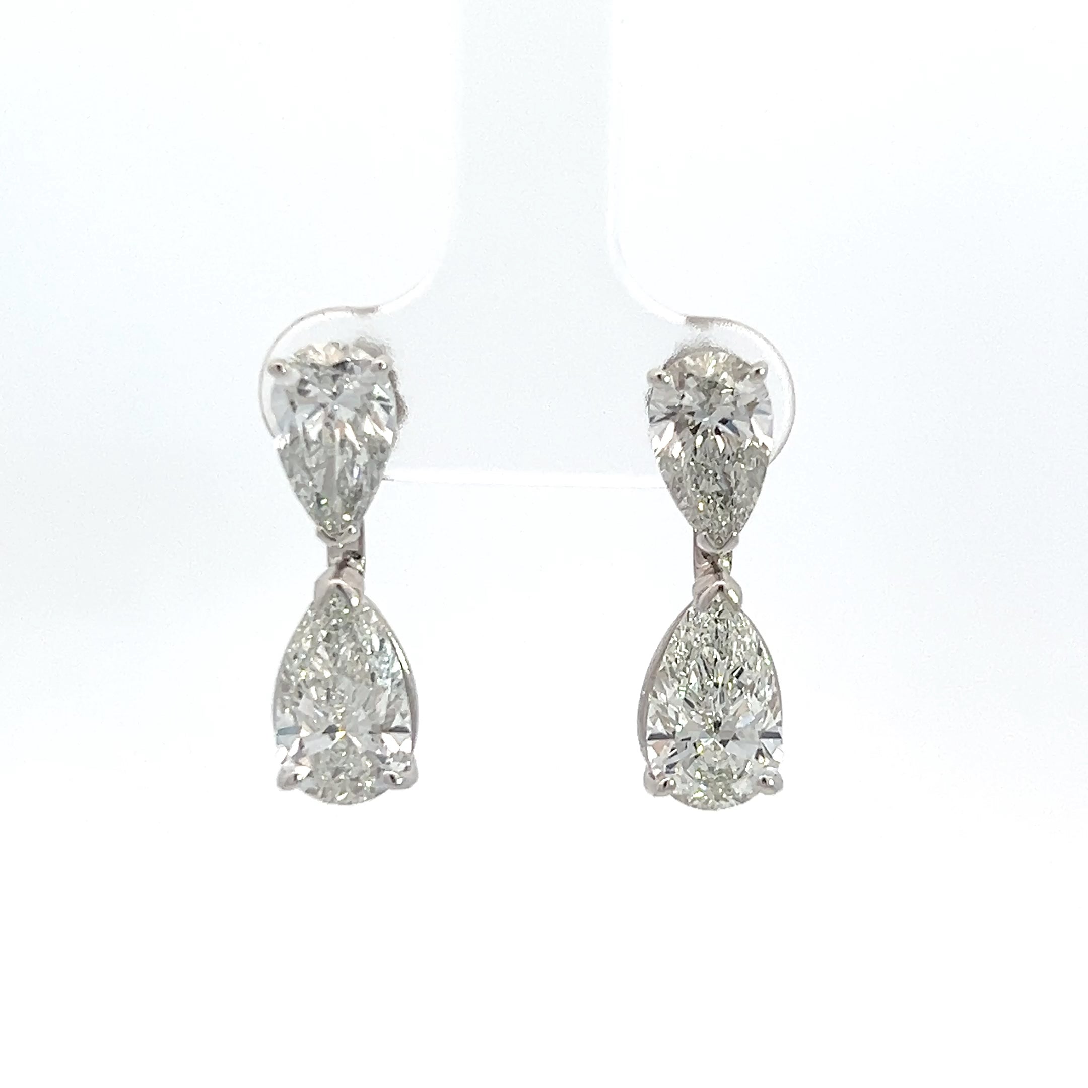 These earrings are crafted in 14k white gold and feature a basket setting with four pear brilliant cut lab grown diamonds with pushback backings.