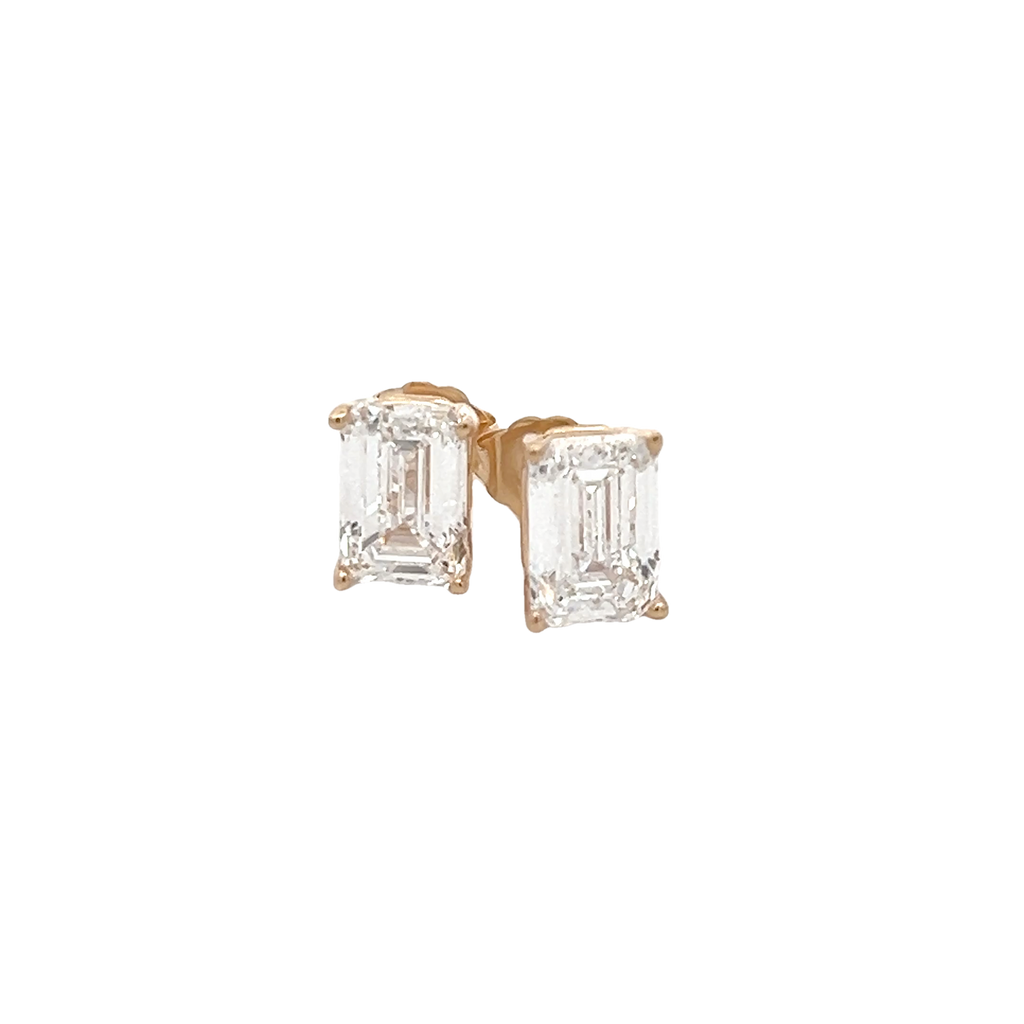 These earrings are crafted in 14k gold and feature a basket setting with two emerald brilliant cut lab grown diamonds with pushback backings.