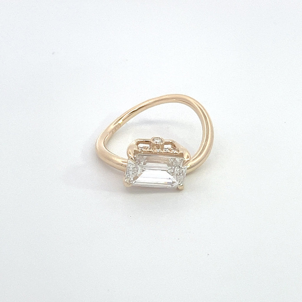 An exquisite ring featuring brilliant emeral cut diamond set in 14K white gold.