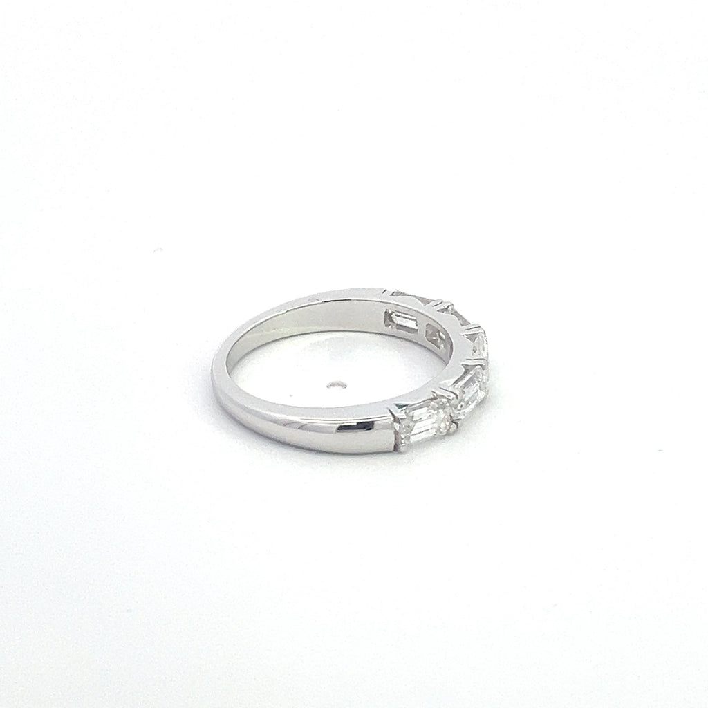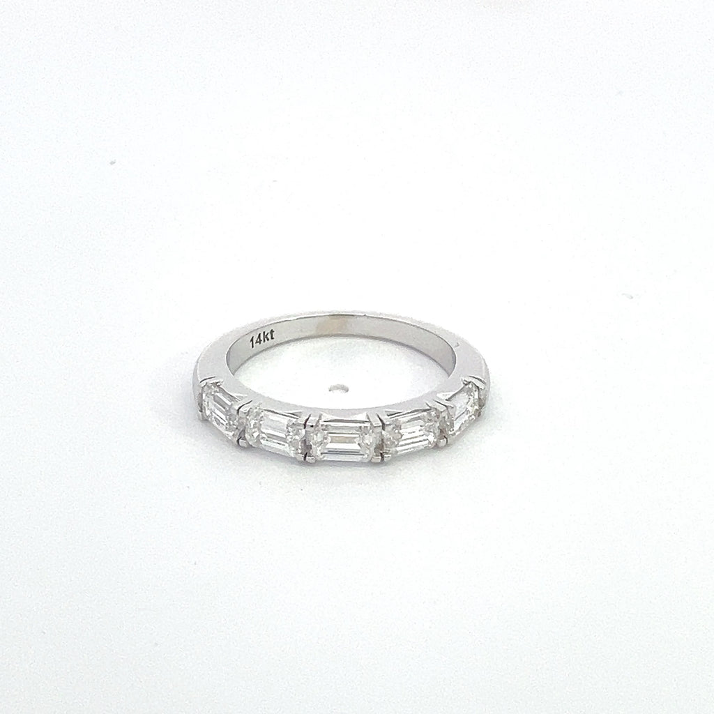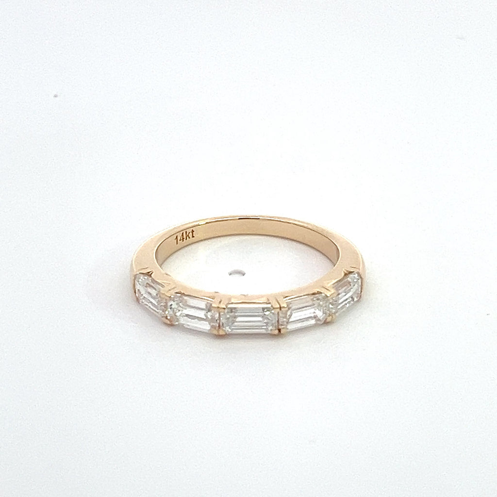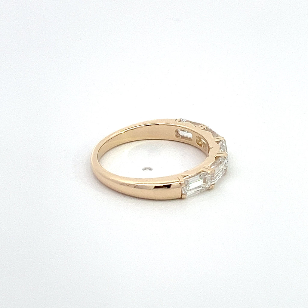This ring features emerald brilliant cut lab grown diamonds. All diamonds are prong set in solid 14k yellow gold. This ring is ideal for layering with other bands or enhancing an engagement ring