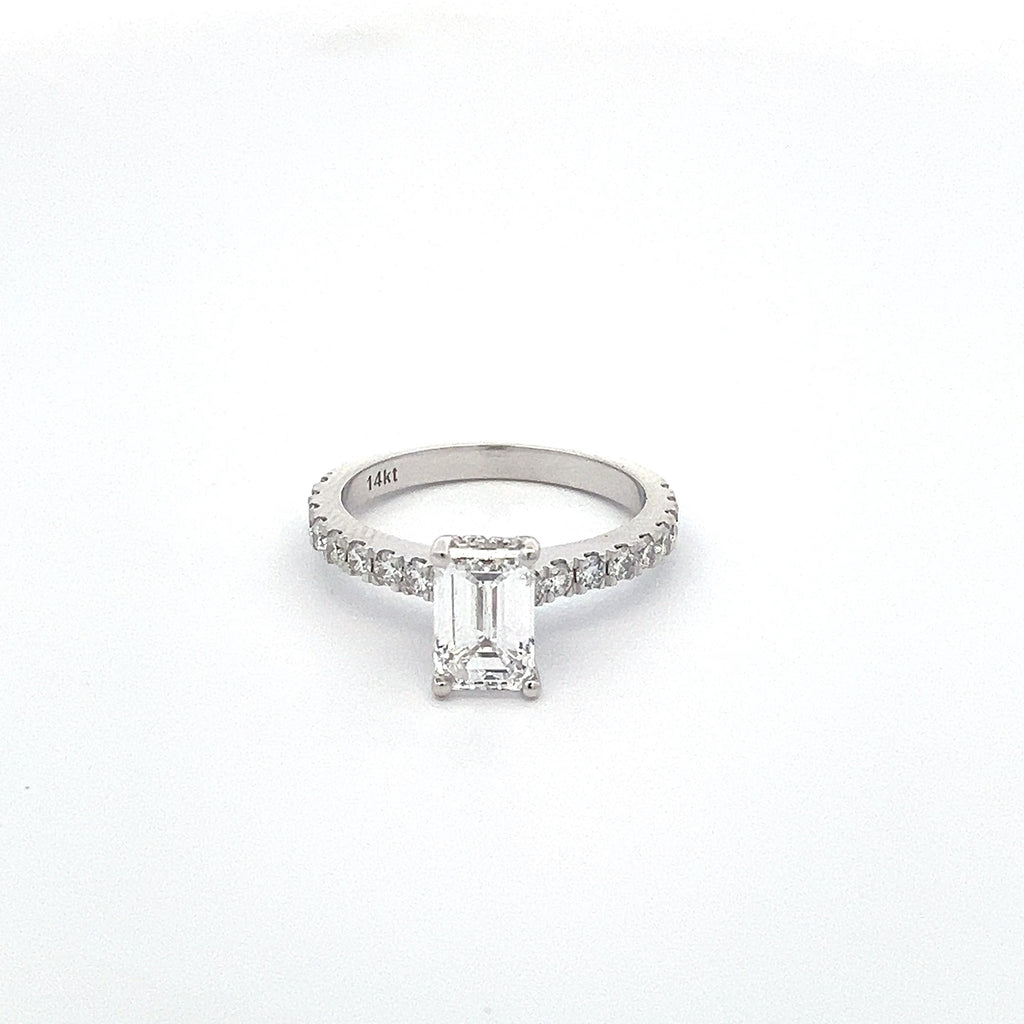 An exquisite engagement ring featuring brilliant emerald cut diamond set in 14K gold. Elegantly crafted to symbolize timeless love and commitment.