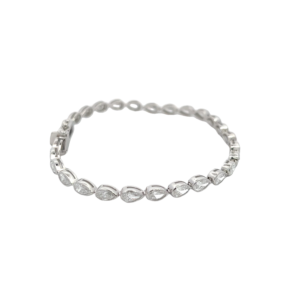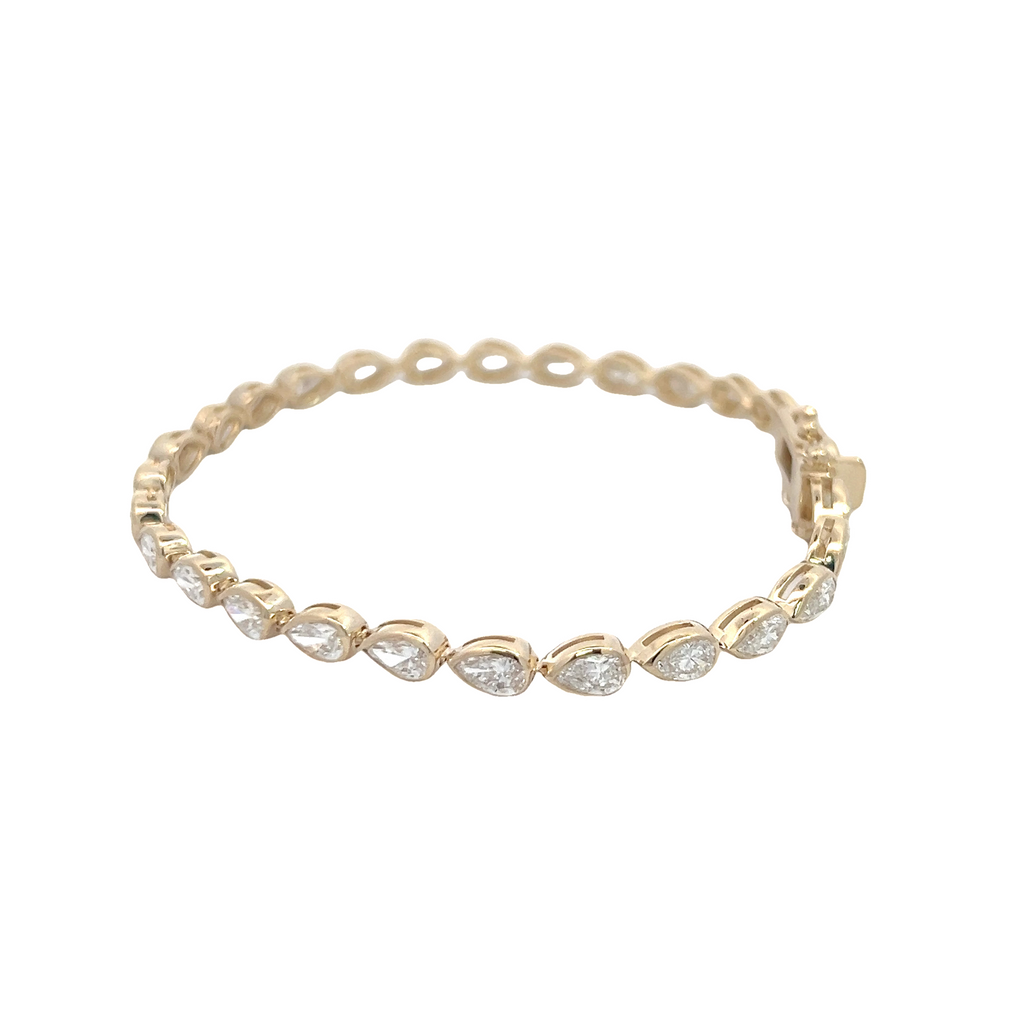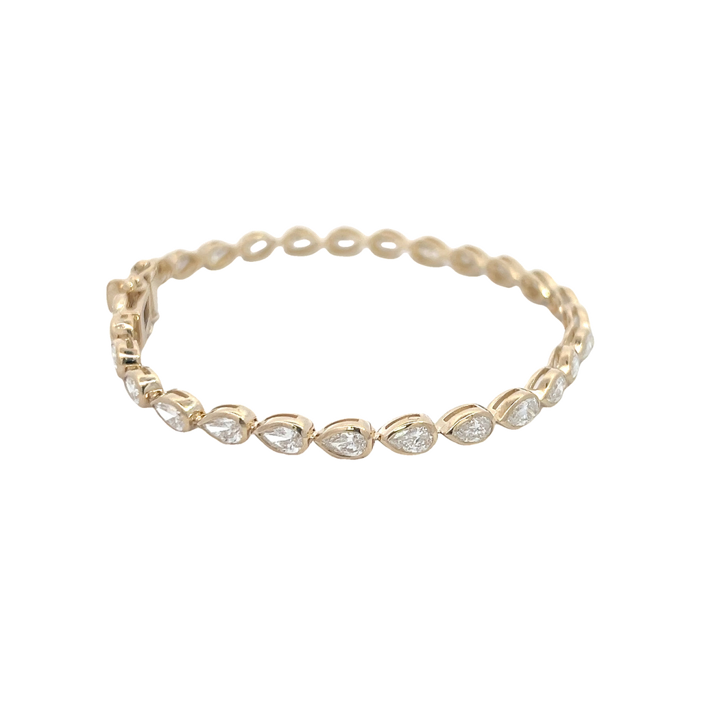 Pear brilliant cut lab-grown diamonds along the length of the bracelet set in 14K gold, 7 inches long with a double safety clasp.