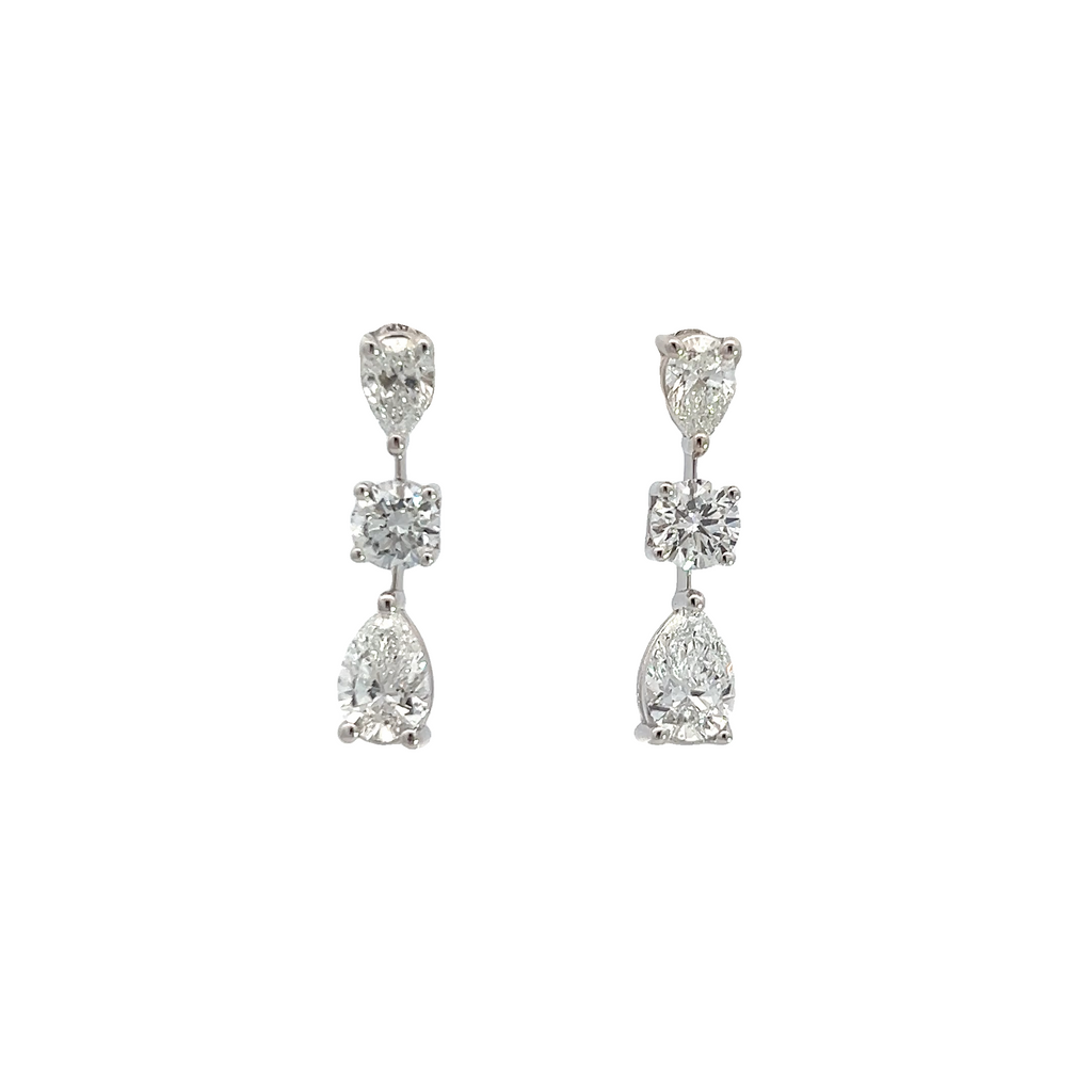 These earrings are crafted in 14k white gold and feature a basket setting with four pear and two round brilliant cut lab grown diamonds with pushback backings.