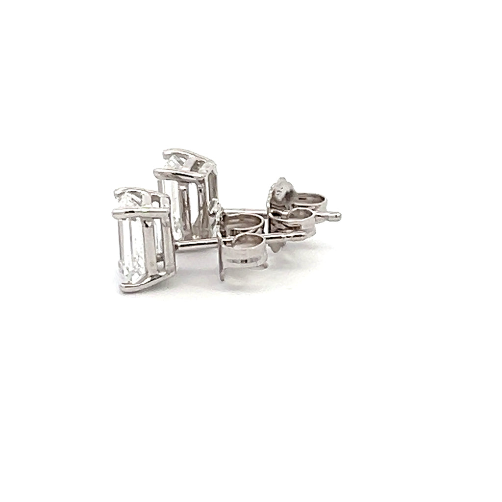 These earrings are crafted in 14k gold and feature a basket setting with two emerald brilliant cut lab grown diamonds with pushback backings.