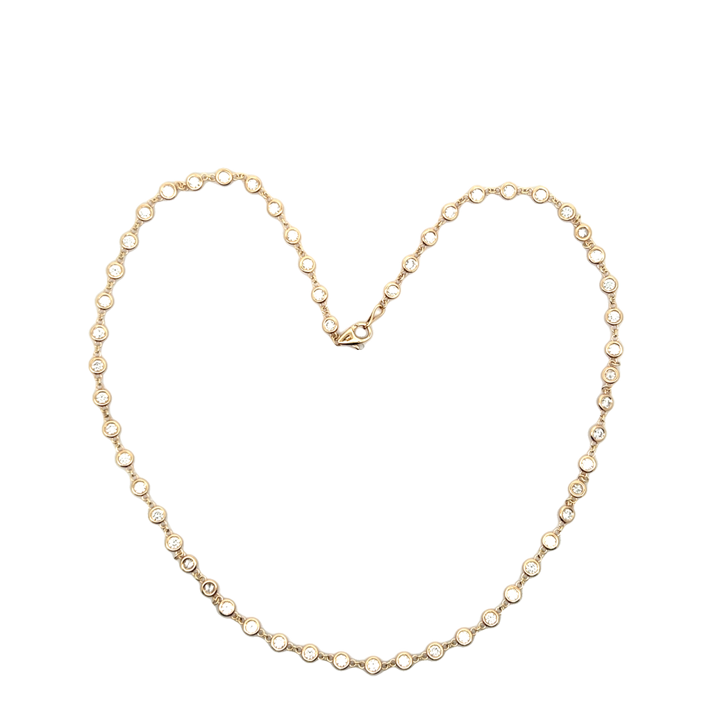 Individually bezel set round brilliant cut lab grown diamonds evenly spaced along the 18" length of the necklace, each connected with a solid gold chain, ending with a strong clasp.