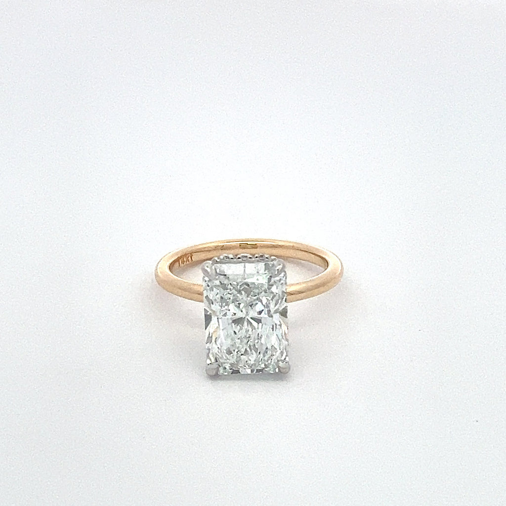 An exquisite engagement ring featuring brilliant radiant cut diamond set in 14K gold. Elegantly crafted to symbolize timeless love and commitment.