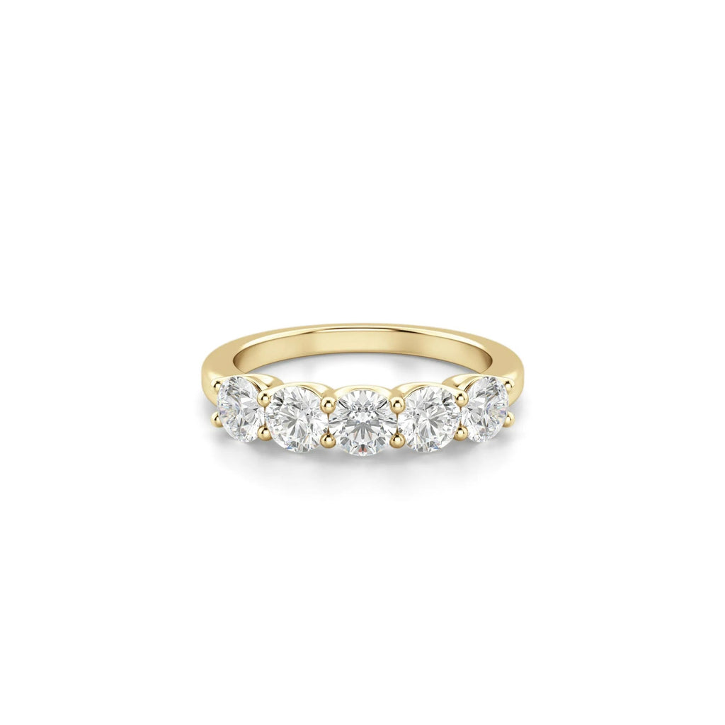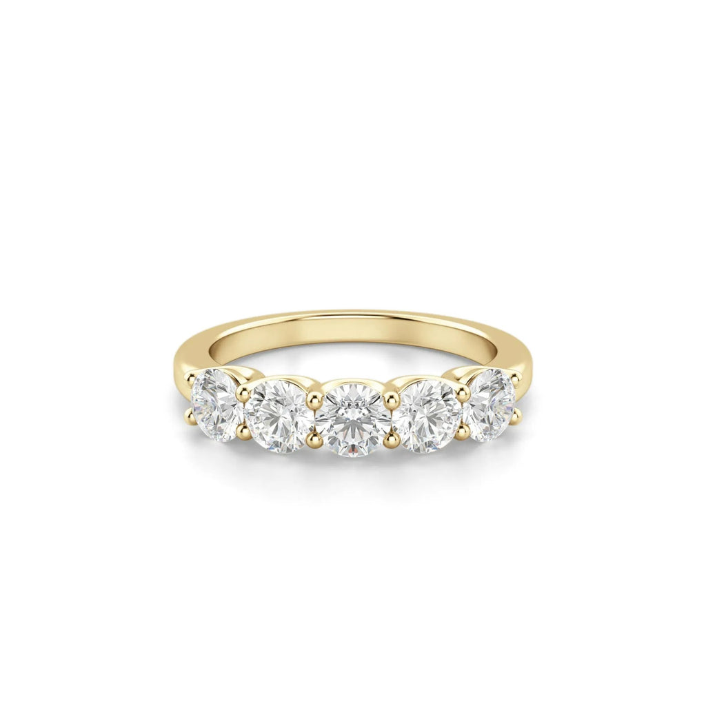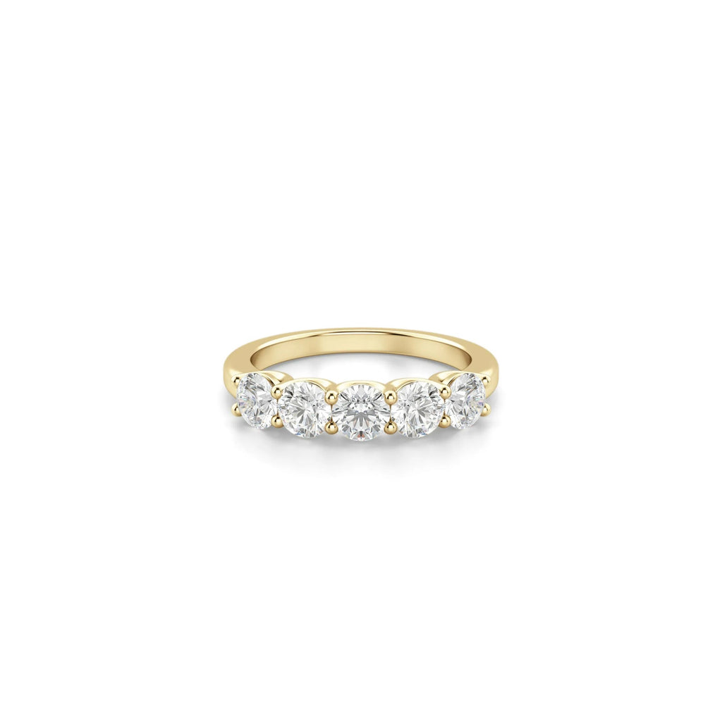 This ring features round brilliant cut lab grown diamonds. All diamonds are prong set in solid 14k gold. This ring is ideal for layering with other bands or enhancing an engagement ring.