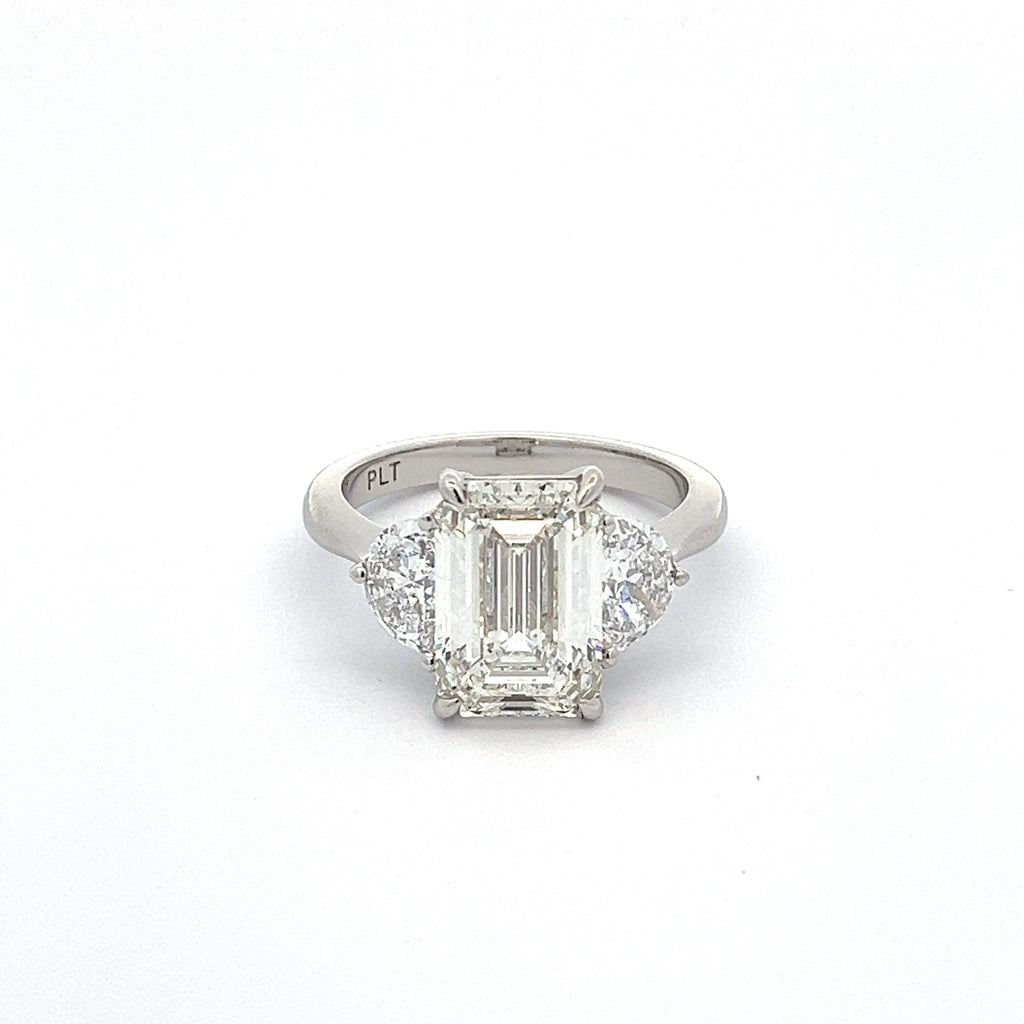 An exquisite engagement ring featuring brilliant emerald cut diamond set in platinum. Elegantly crafted to symbolize timeless love and commitment.