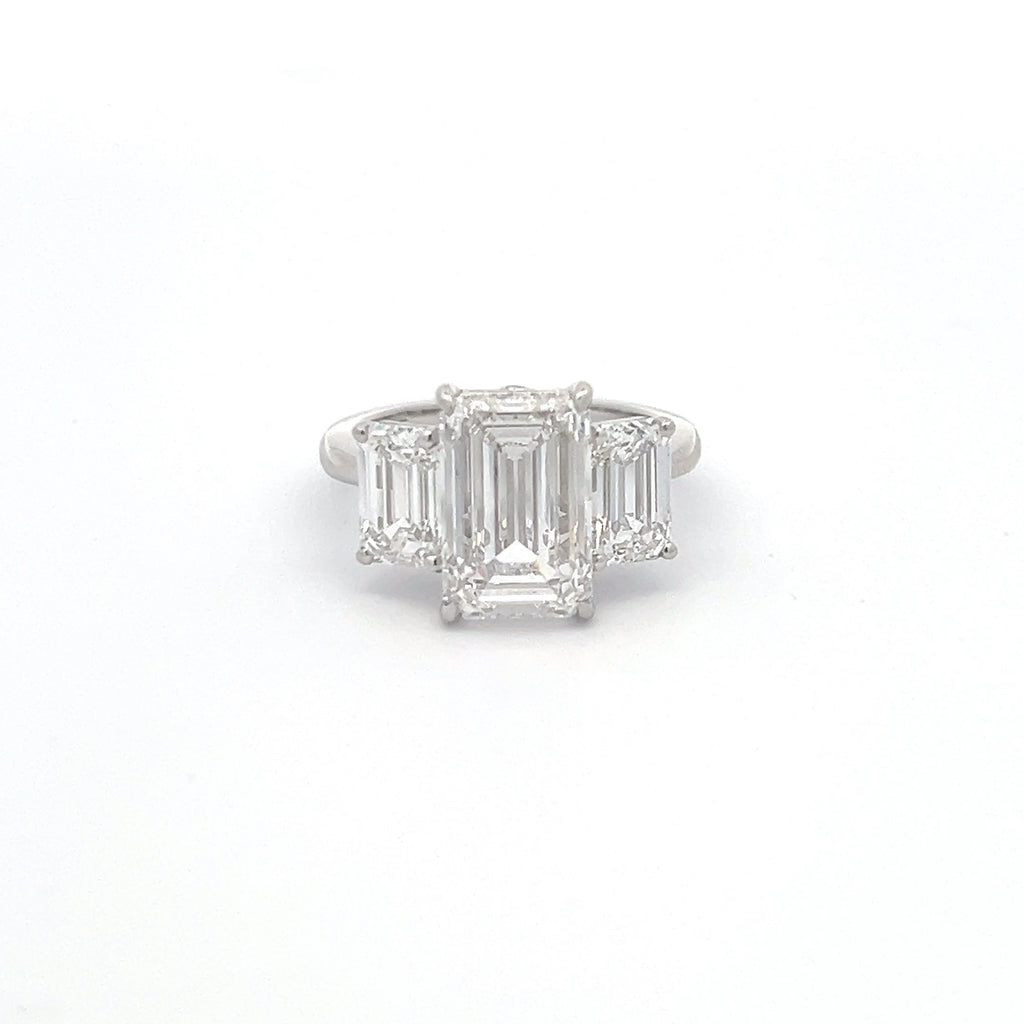 An exquisite engagement ring featuring brilliant emerald cut diamond set in platinum. Elegantly crafted to symbolize timeless love and commitment.