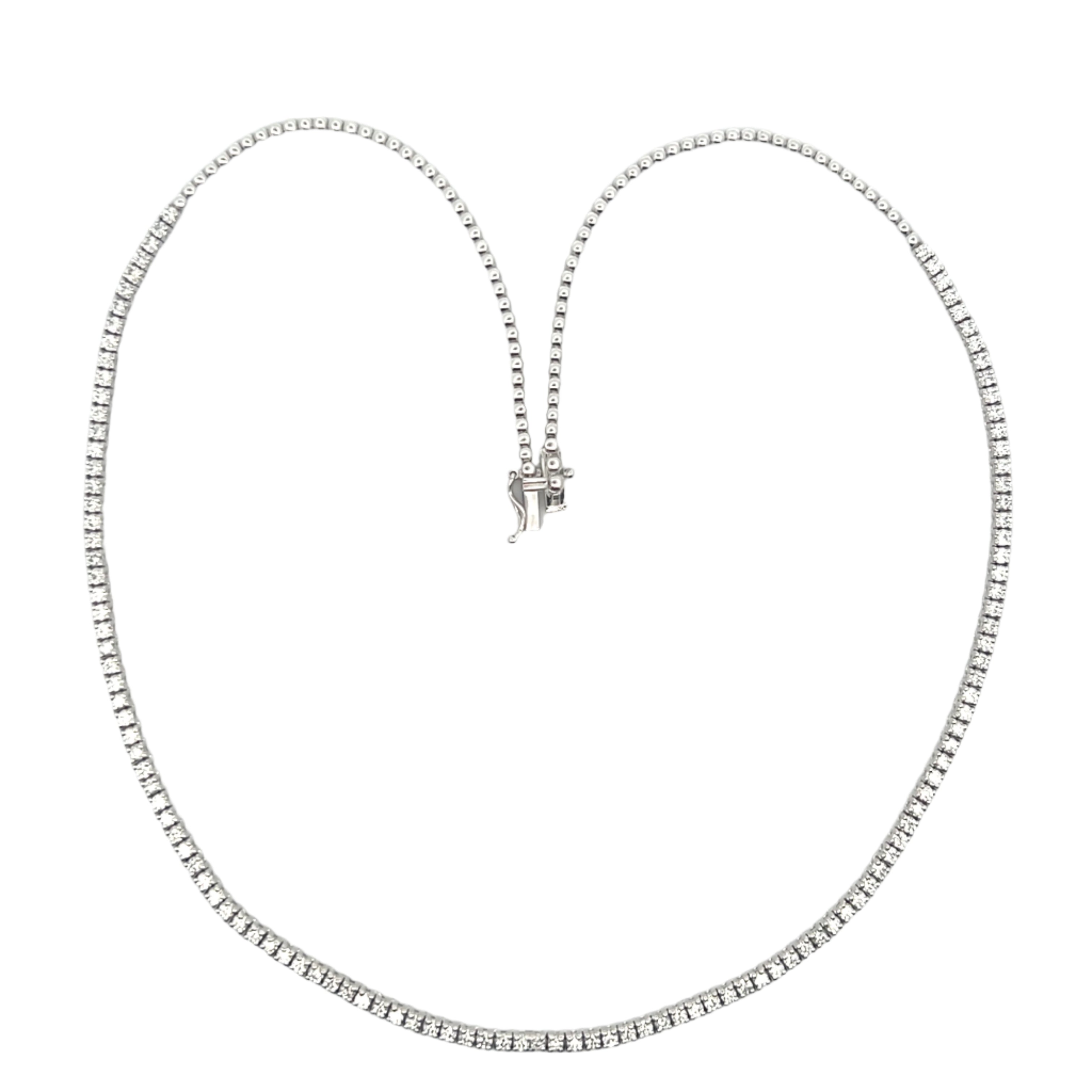 Individually prong set round brilliant cut diamonds along the length of the necklace with a double safety clasp