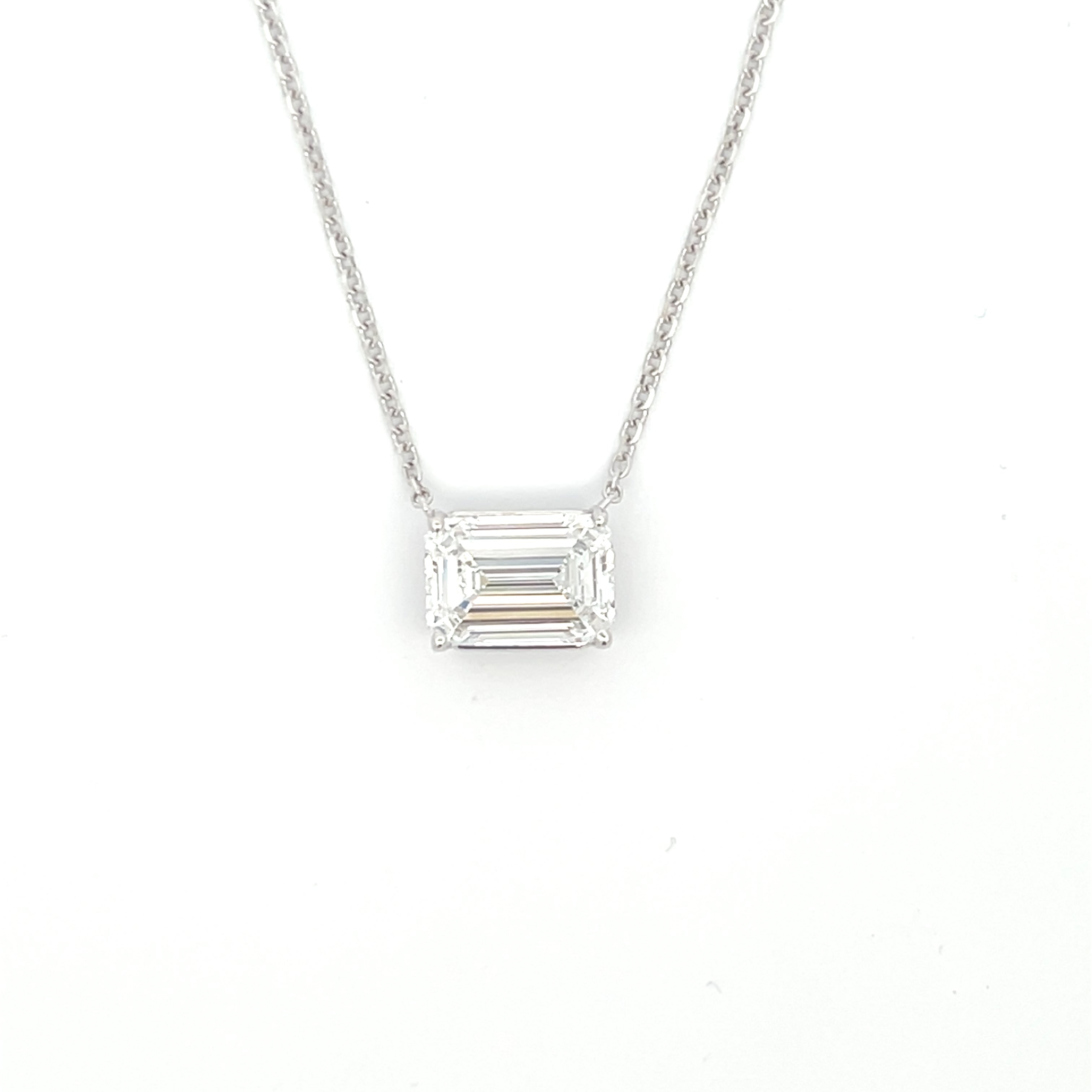 An 18-inch necklace featuring a prong-set, lab-grown emerald diamond solitaire. All set in 14K gold.