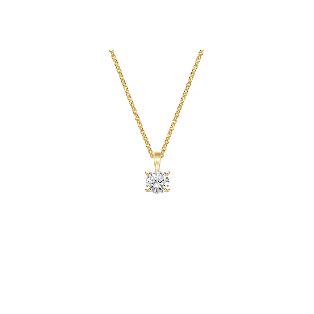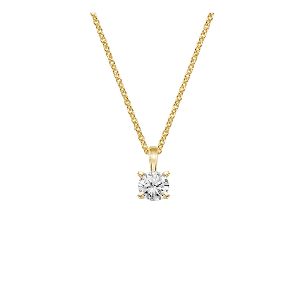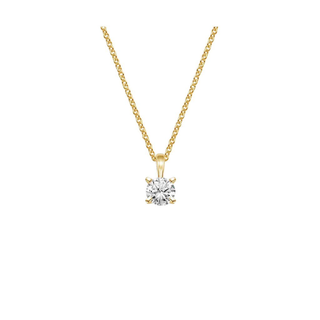 An 18-inch necklace featuring a bail-set, lab-grown round diamond solitaire. All set in 14K gold.