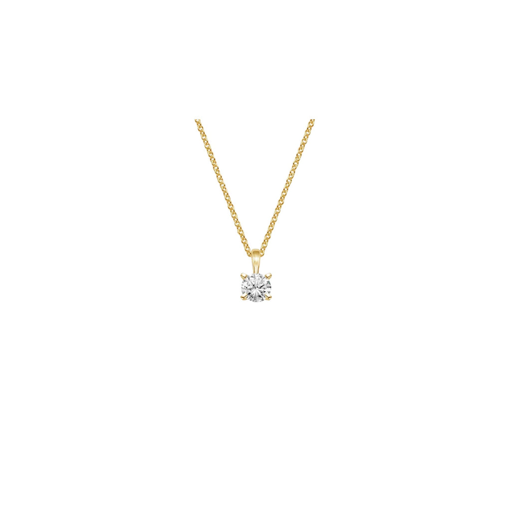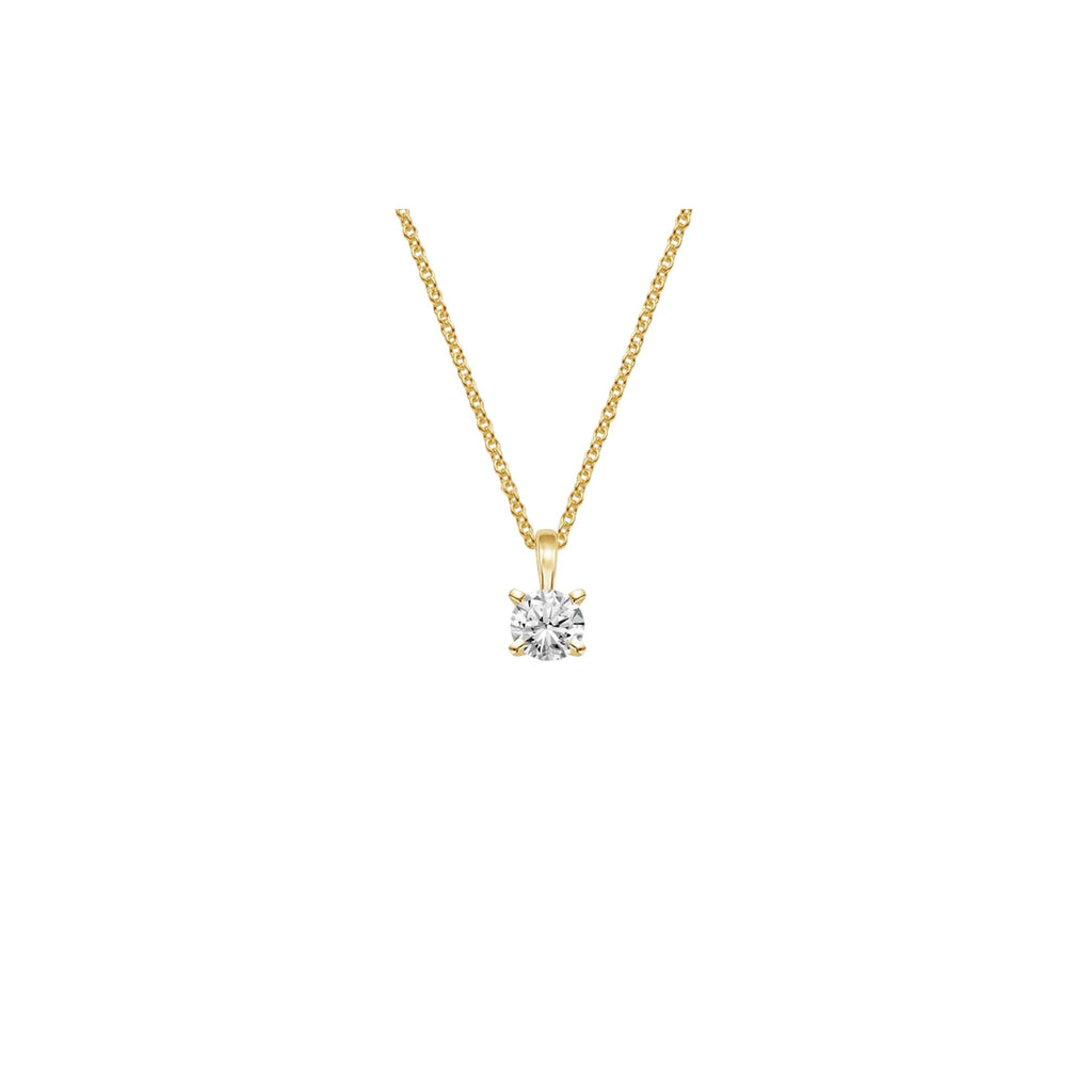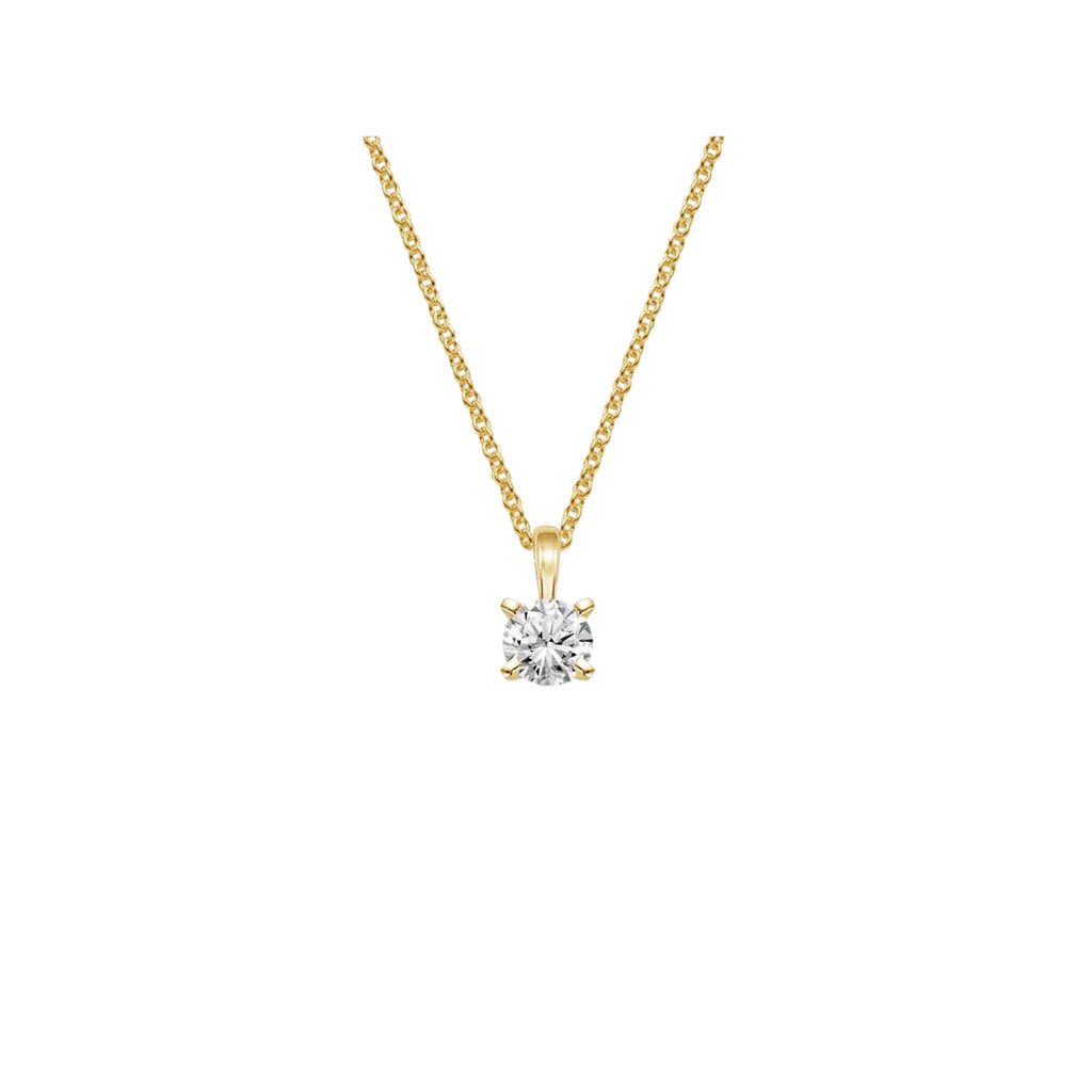 An 18-inch necklace featuring a bail-set, lab-grown round diamond solitaire. All set in 14K gold.