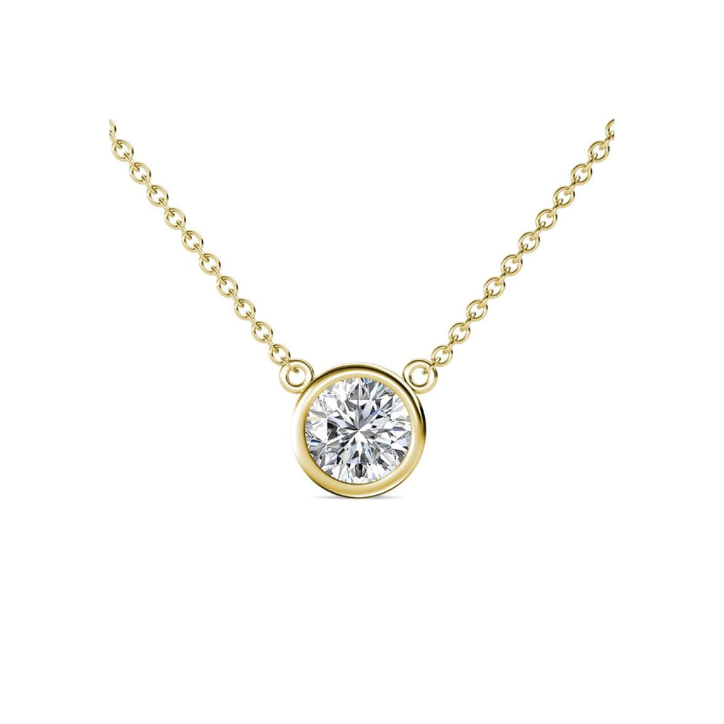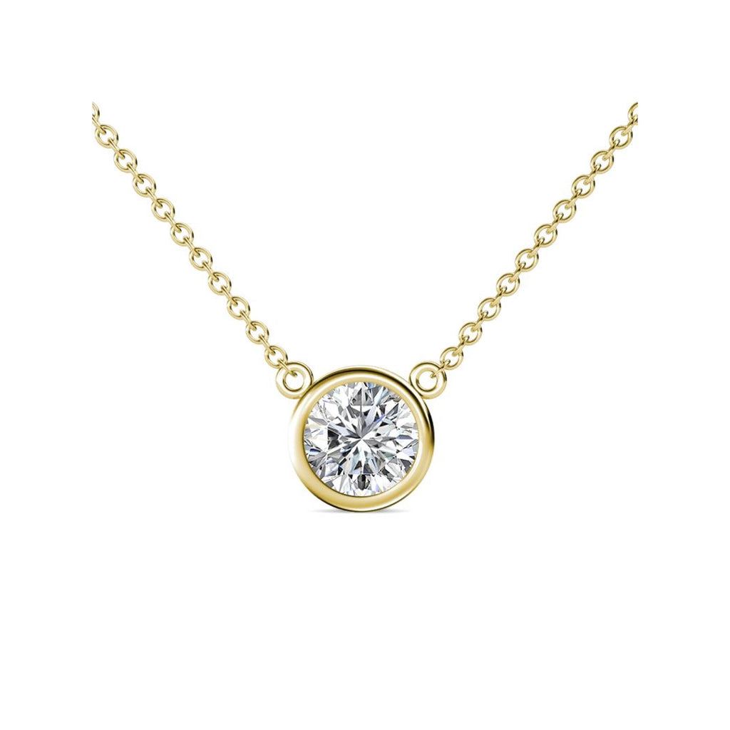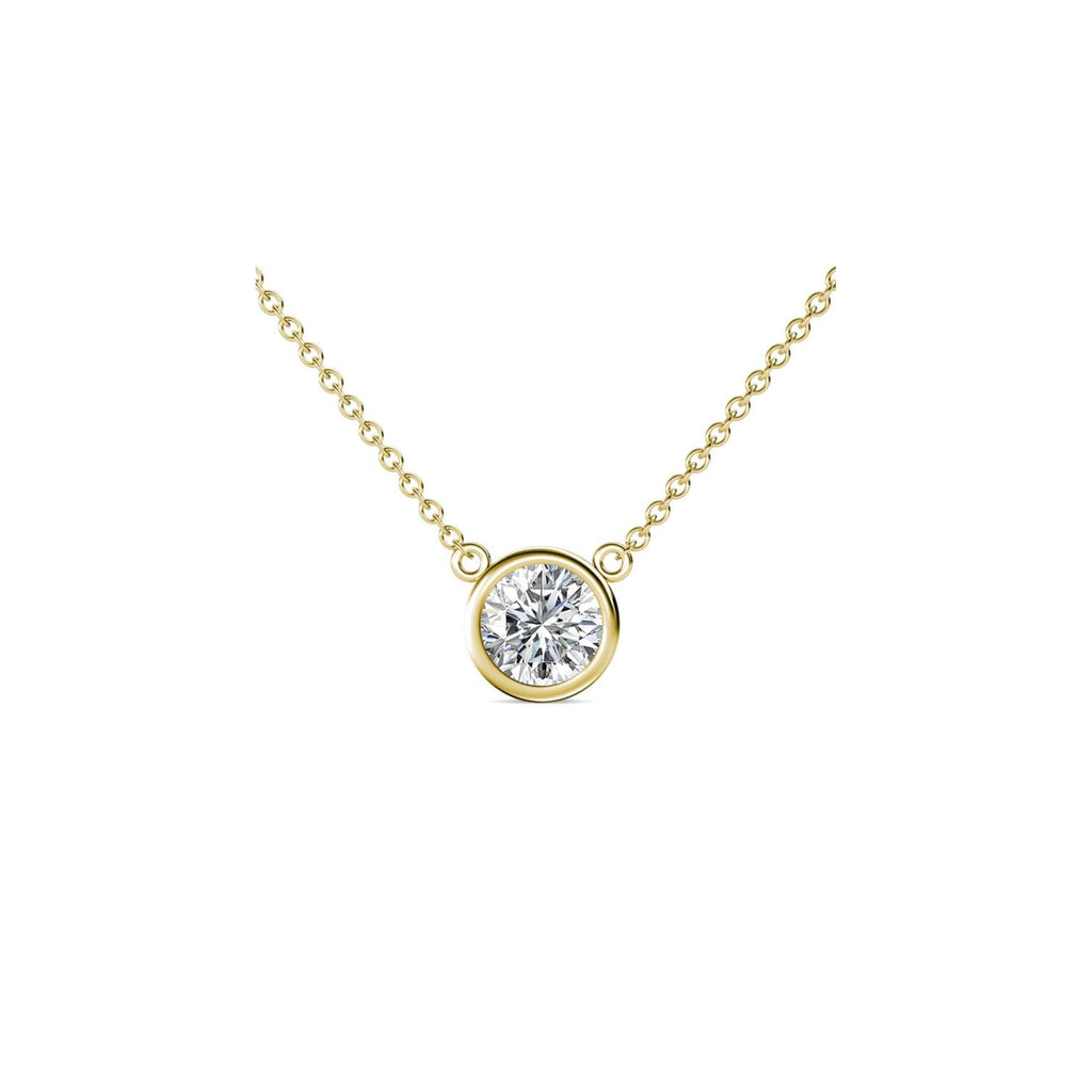 An 18-inch necklace featuring a bezel-set, lab-grown round diamond solitaire. All set in 14K gold.