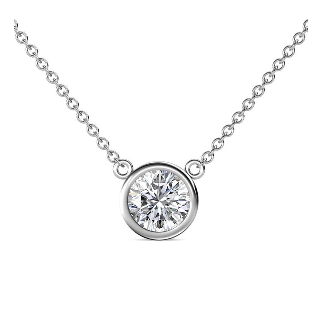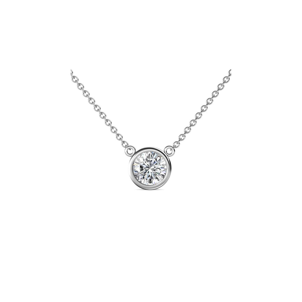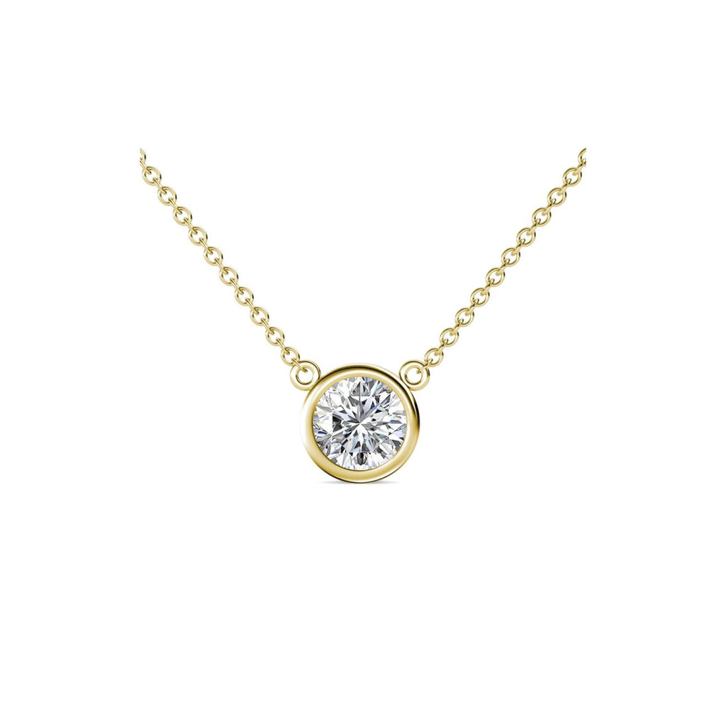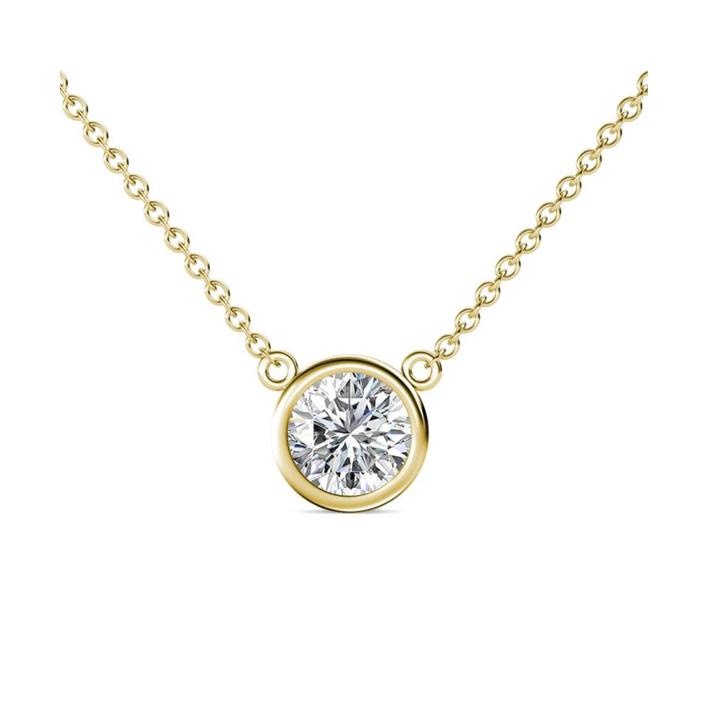 An 18-inch necklace featuring a bezel-set, lab-grown round diamond solitaire. All set in 14K gold.