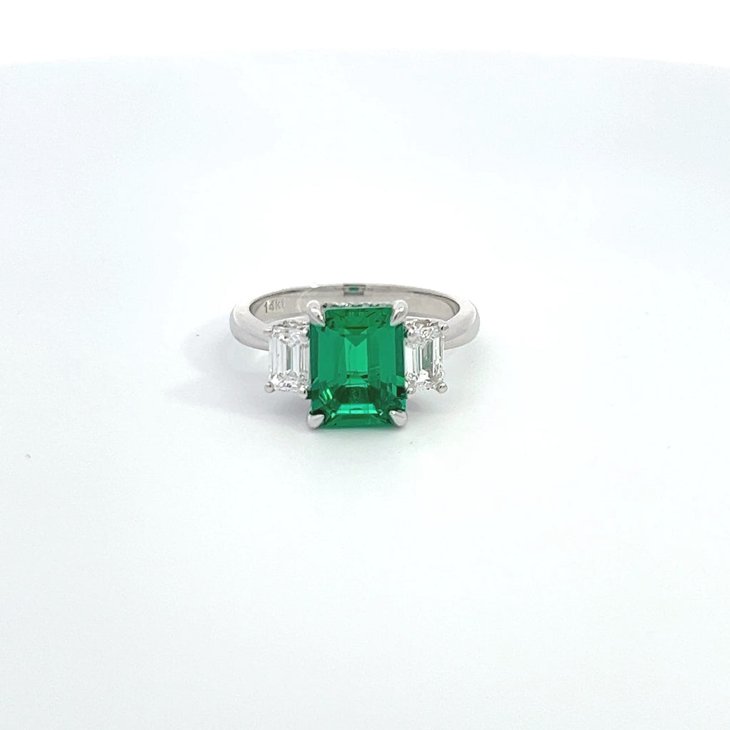 An exquisite engagement ring featuring a emerald set in 14K white gold. Elegantly crafted to symbolize timeless love and commitment.