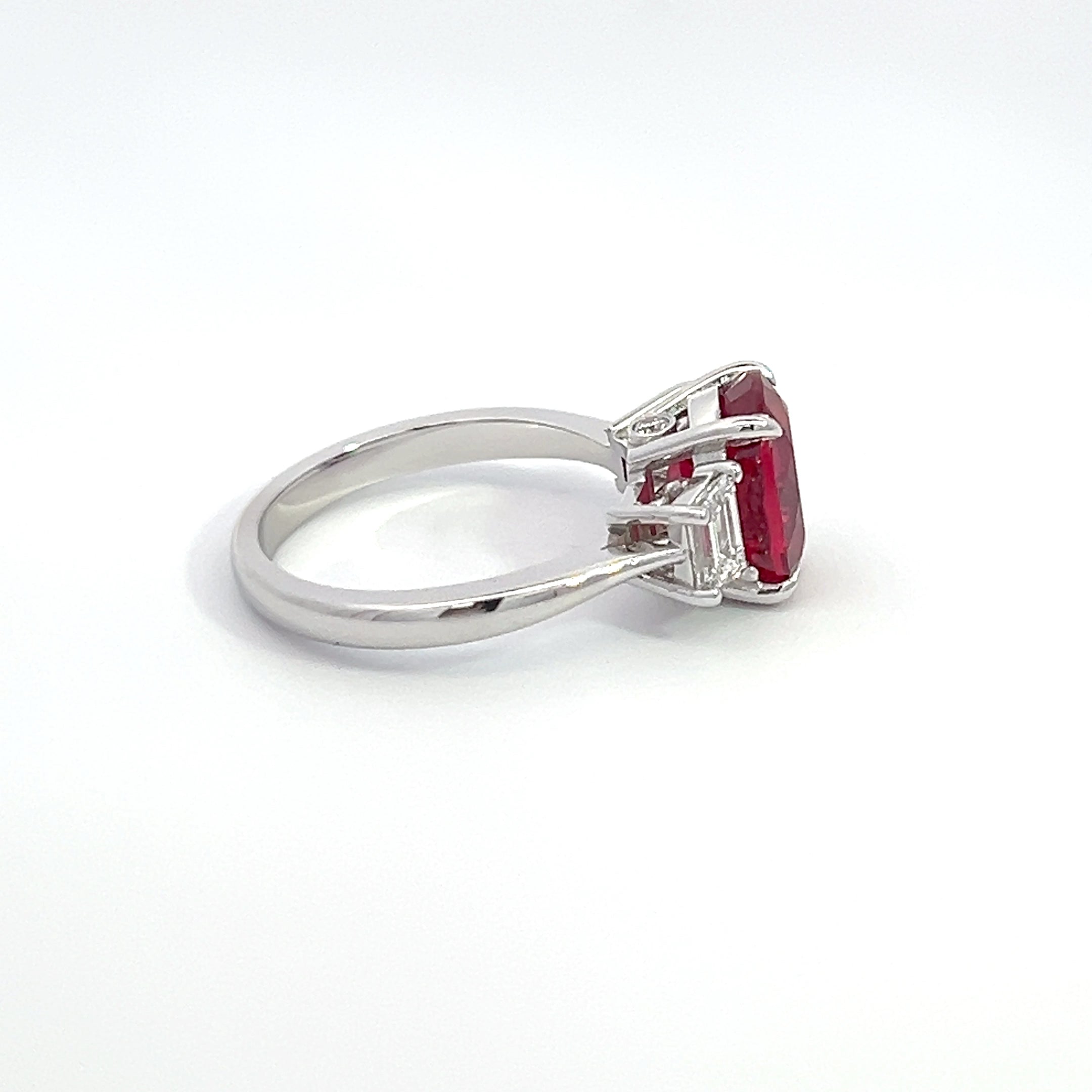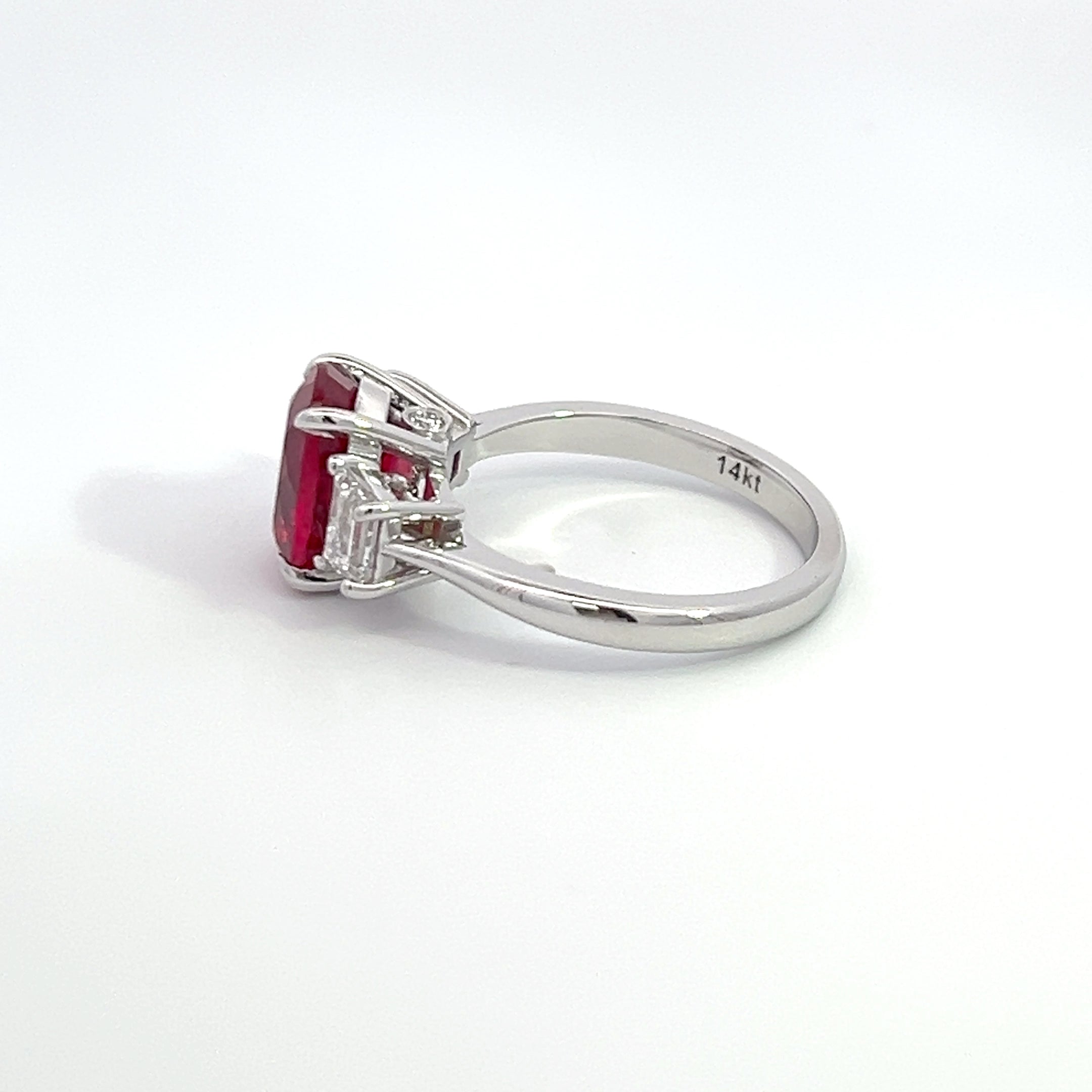 An exquisite engagement ring featuring a ruby set in 14K white gold. Elegantly crafted to symbolize timeless love and commitment.