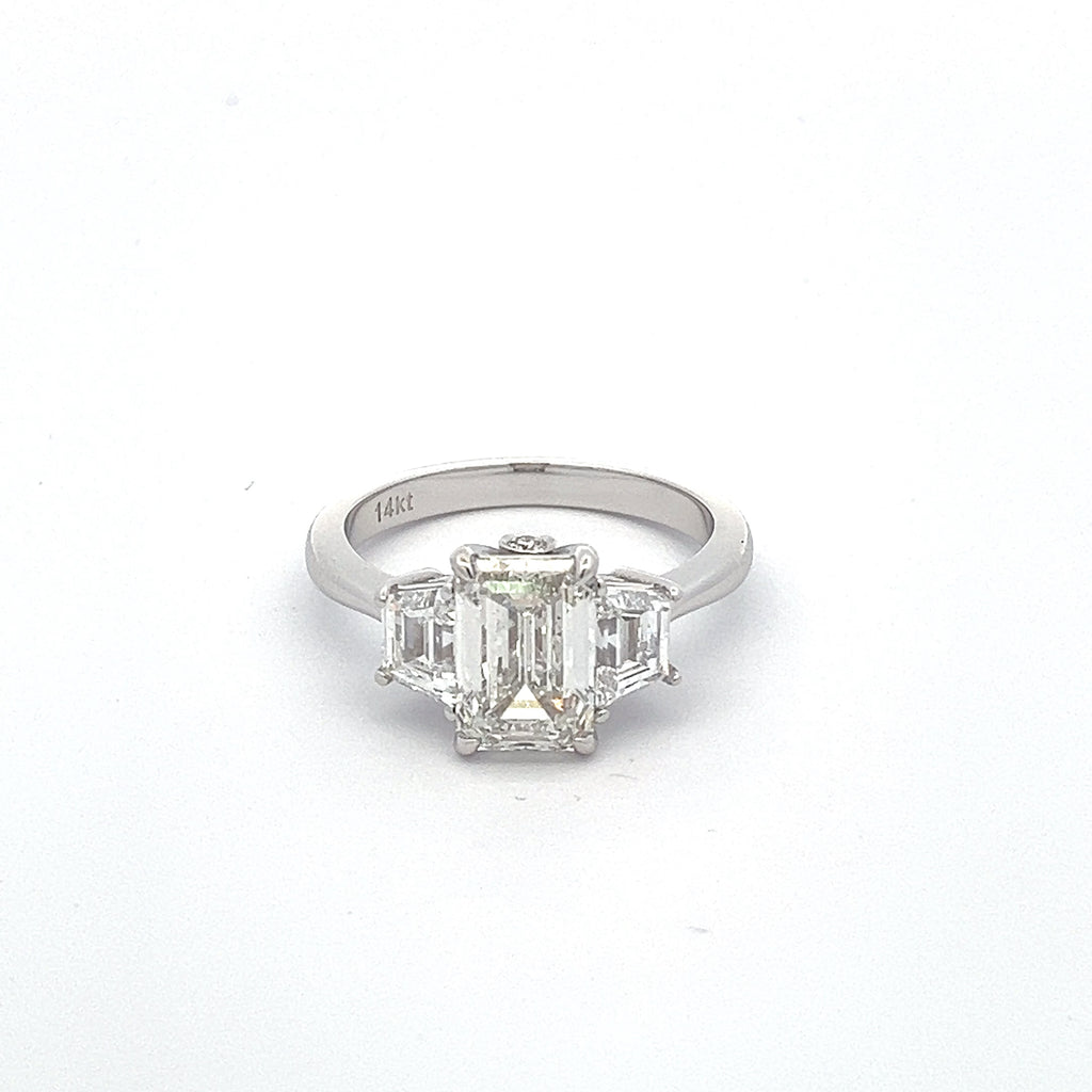 An exquisite engagement ring featuring brilliant emerald cut diamond set in 14K gold. Elegantly crafted to symbolize timeless love and commitment.