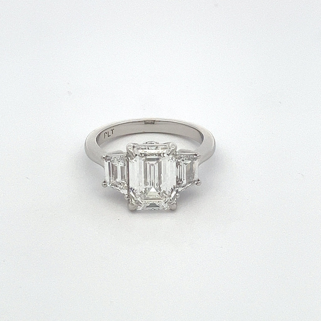 An exquisite engagement ring featuring brilliant emerald cut diamond set in platinum. Elegantly crafted to symbolize timeless love and commitment.