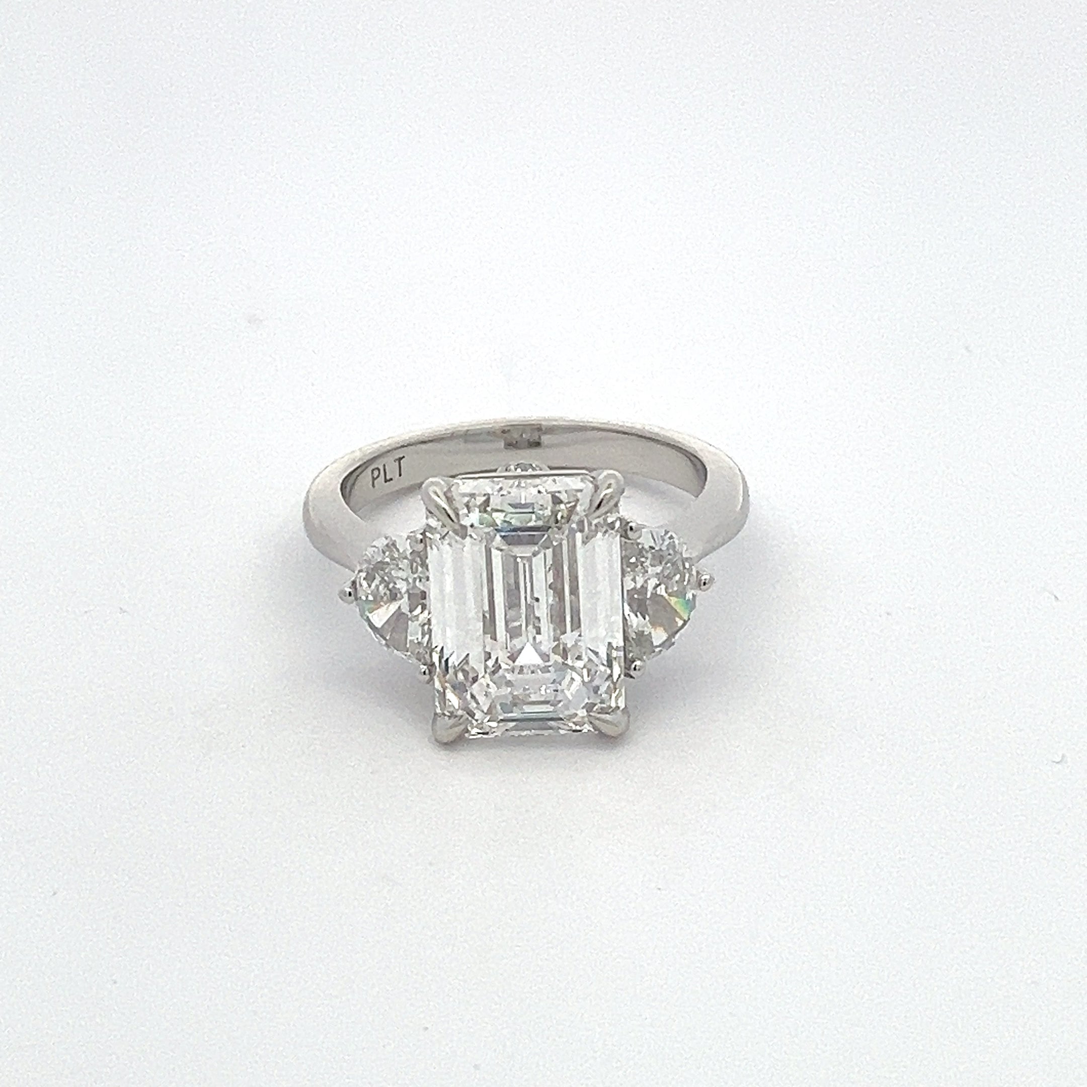 An exquisite engagement ring featuring brilliant emerald cut diamond set in platinum. Elegantly crafted to symbolize timeless love and commitment.