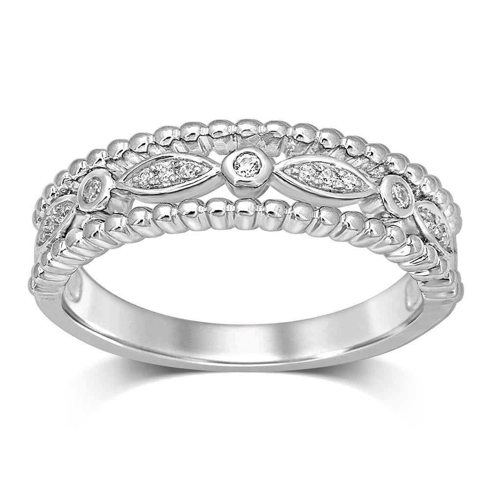 Fashioned in fine 14K white gold, this sparkling stack band is set with shimmering diamonds, totaling 1/20 ct. and polished to a brilliant shine. Best Valentine's gift to your love one?