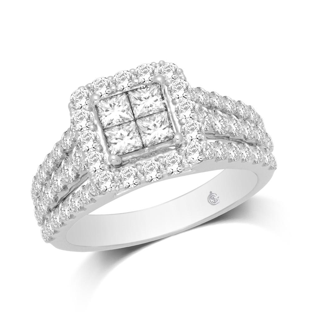 This eye-catching Engagement Ring is available in 14K White Gold. There are 60 princess / round diamonds with a total carat weight of 2 ct set in a invisible setting / prong setting.