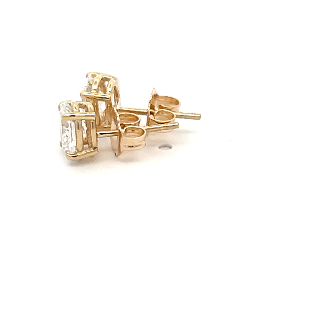 These earrings are crafted in 14k gold and feature a basket setting with two oval brilliant cut lab grown diamonds with pushback backings.