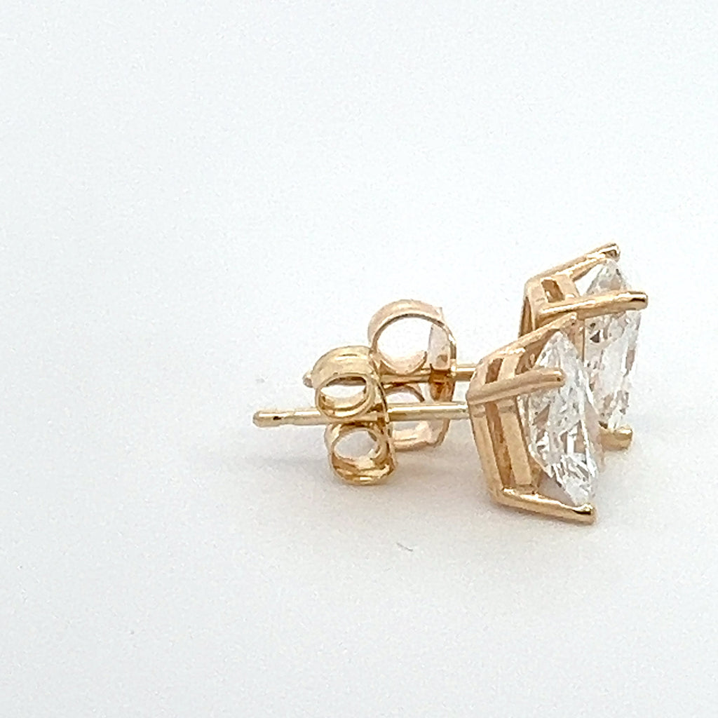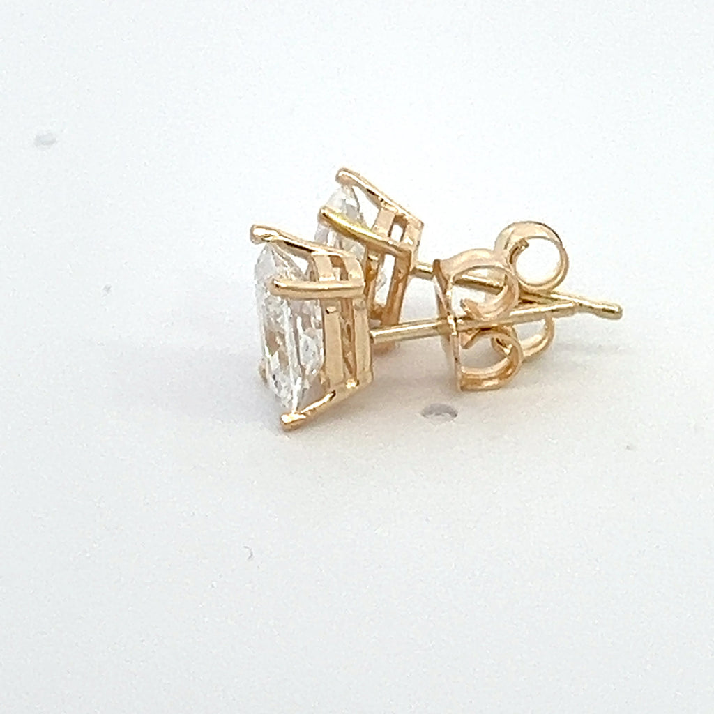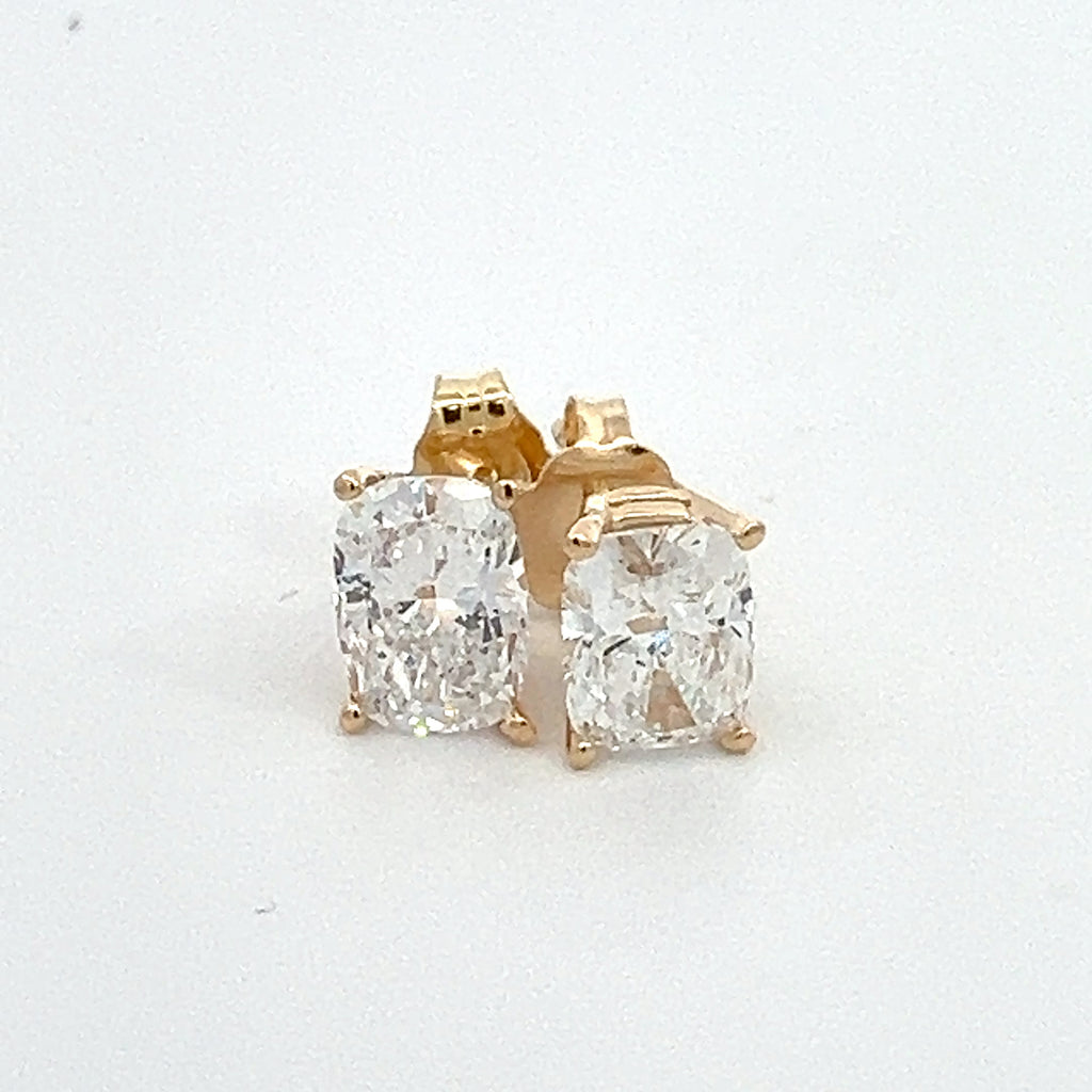 These earrings are crafted in 14k gold and feature a basket setting with two cushion brilliant cut lab grown diamonds with pushback backings.